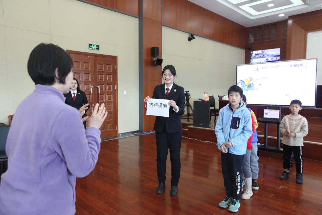 第一个游戏“你说我猜”瞬间点燃现场气氛。“三点水加一个去!”“法官判案子要靠什么?”孩子们手舞足蹈地比划,家长们绞尽脑汁地猜测,家庭间的默契在欢声笑语中升温。游戏结束后,法官趁热打铁,为大家细致讲解专业的法律词汇,让知识在互动中悄悄扎根。
