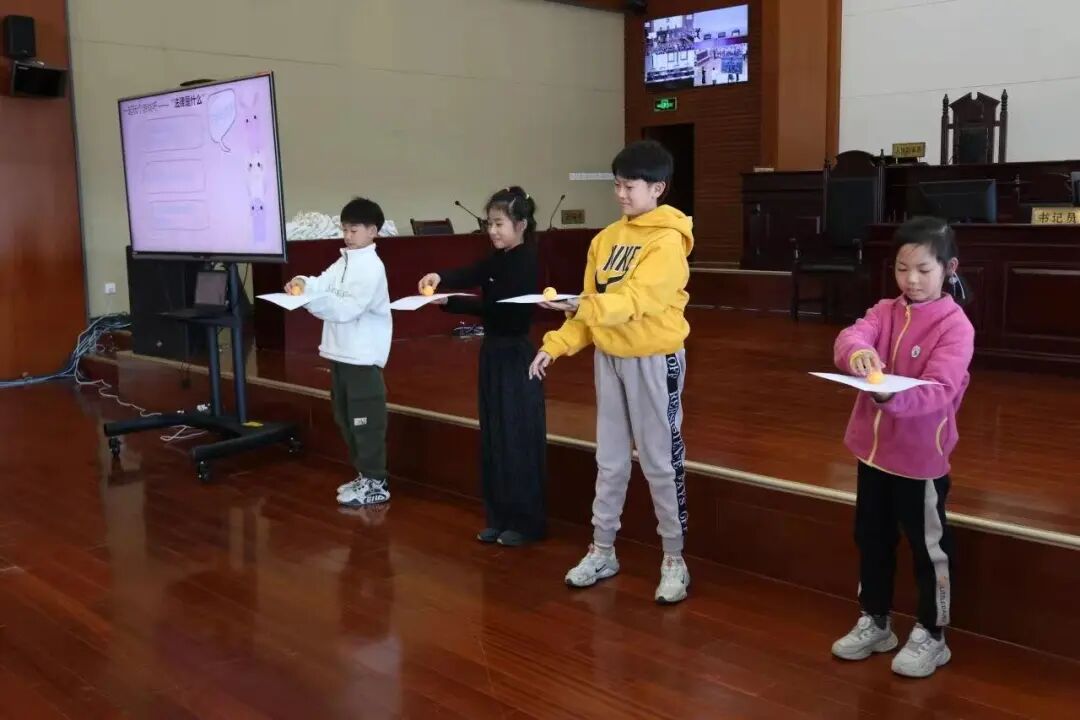 “哇,这样小球就不会掉啦!”第二个“法律是什么”游戏里,孩子们经历了从单手托球的“心惊胆战” 到改造白纸后的“轻松通关”。法官笑着引导:“折起来的‘围墙’就像法律的边界,看似限制自由,实则保驾护航。”孩子们频频点头,此刻他们已深深明白,规则是成长最温暖的铠甲。