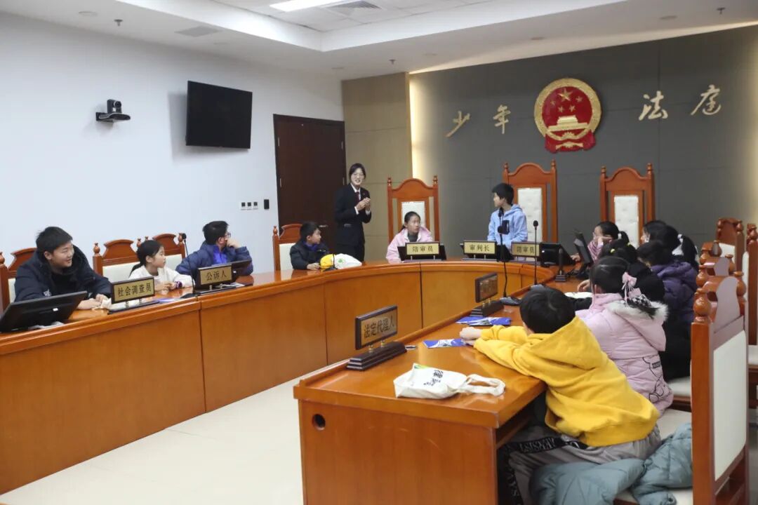 “这里也太好玩了吧!”多功能室里传来孩子们的惊呼,温馨的布置让严肃的法院多了几分暖意。走进少年法庭,孩子们立刻发现了它与普通法庭的不同,“桌子是连在一起的,像英文字母U!”“法官的桌子和被告人是一样高,法官不再高高在上!”在法官的讲解下,孩子们逐渐明白,这些细节设计都是为了让少年法庭更具亲和力,体现了司法对未成年人的尊重与爱护。“为什么不放一个课桌在被告人这里?”大家争先恐后地提问和抢答,对法律的好奇在探索中不断发酵。