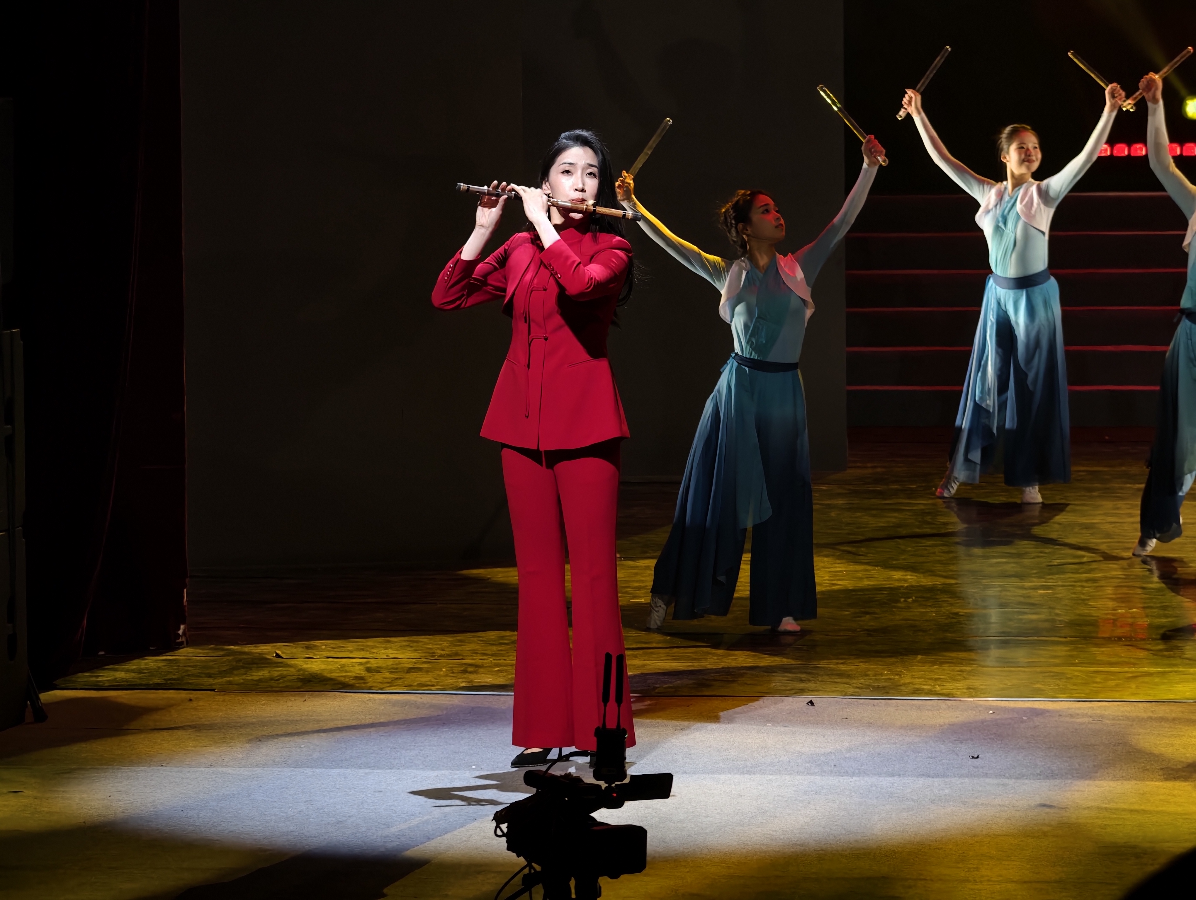 中国歌剧舞剧院青年竹笛、排箫演奏家,被观众亲切称为“国民闺女”的孙楚泊倾情献奏。舞台上,孙楚泊的竹笛声清越悠扬,与北京戏曲艺术职业学院舞蹈演员的刚劲舞姿完美融合。笛声如诉,传递出丰台发展的从容底气;鼓点激昂,舞者们以矫健的身姿展现出全区上下砥砺奋进的磅礴力量。