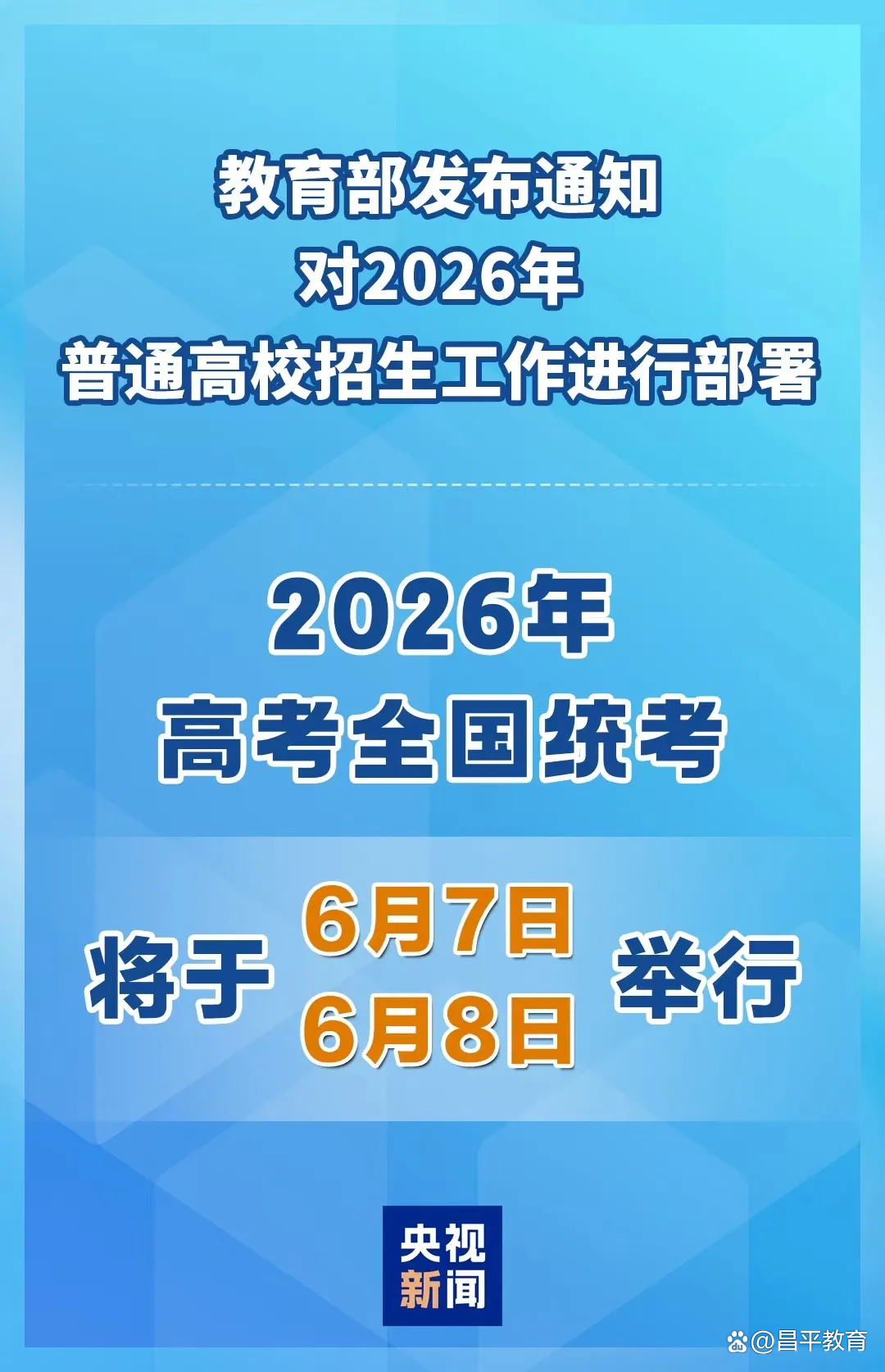 教育部22日发布通知,对2026年普通高校招生工作进行部署,2026年高考全国统考将于6月7日、8日举行。