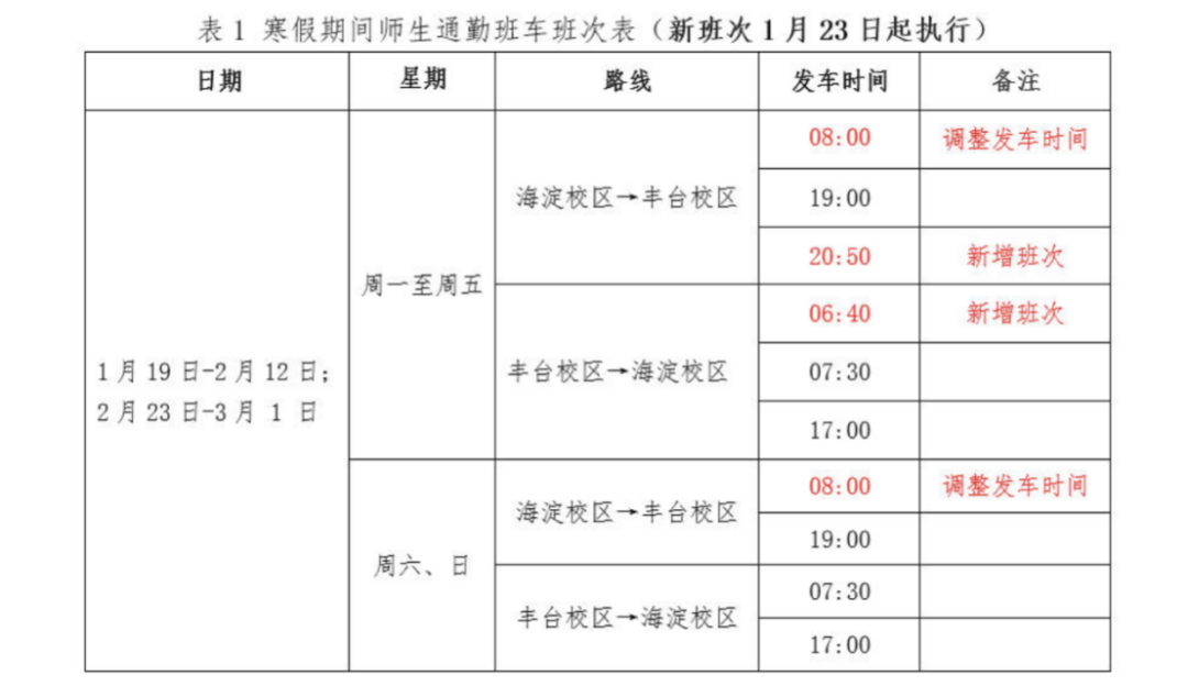 为方便我校师生出行便利,1月23日起,对寒假期间两校区通勤班班次表进行调整。
