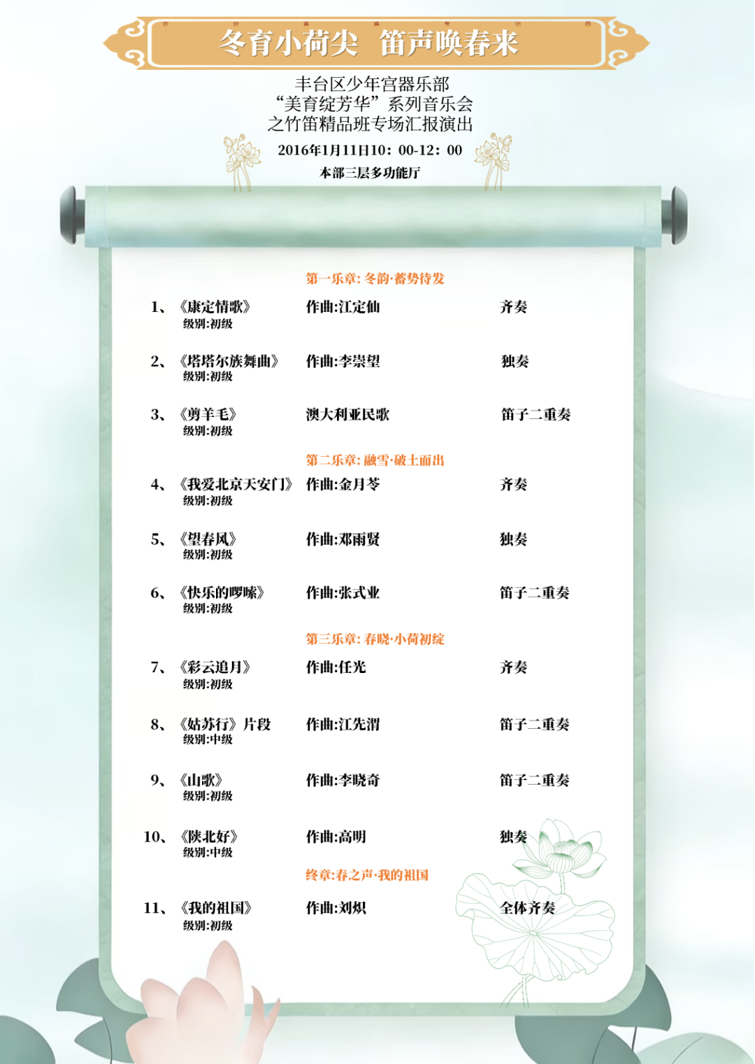 近期,丰台区少年宫器乐部"美育绽芳华"系列音乐会之竹笛精品班教学汇报专场圆满落幕。本场演出以“冬育小荷尖·笛声唤春来”为主题,通过三个篇章展现孩子们在时光更迭中的音乐成长历程,少年宫领导与家长们共同见证了此次教学汇报的优秀成果。