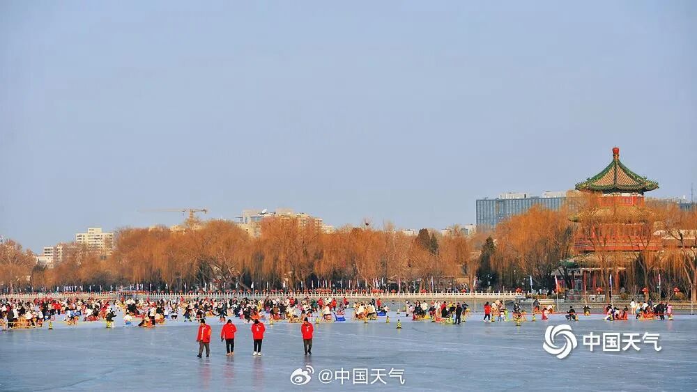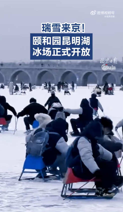 开放首日,冰场已迎来众多游客,大片晶莹的冰面上是古色古香的皇家古建,游客在游玩嬉戏间,是在其它任何冰场都不会有的特殊体验和乐趣,也为静谧的古典园林增添了生机盎然的冬日活力。