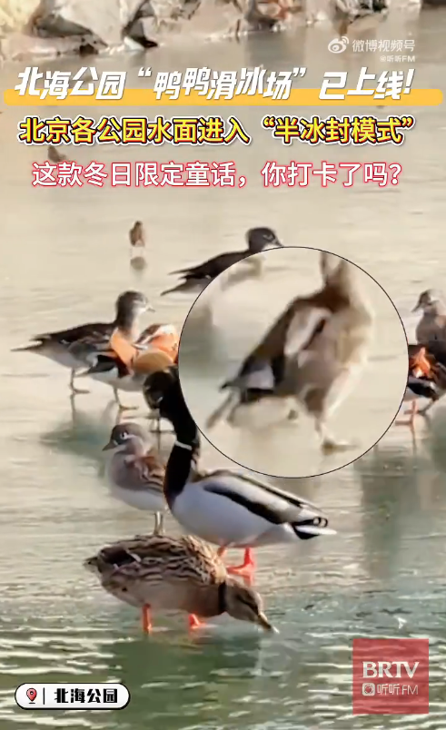 在北京城的另一处冰面上,北海公园白塔下的水鸟们,则替游客抢先体验了一把北海冰场的坚硬程度,它们迈着摇摇晃晃的小碎步,亦步亦趋的萌态,让网友直呼“简直演我第一次滑冰,真的太可爱了!”