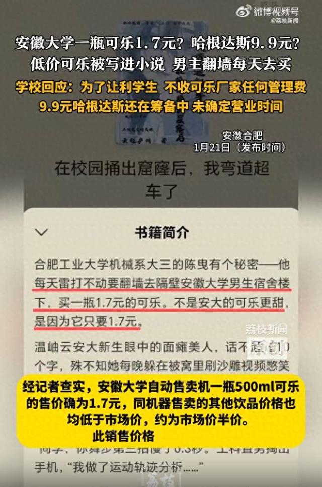近日,有网友发现,安徽大学自动售卖机1.7元一瓶的可乐被写进校园小说。