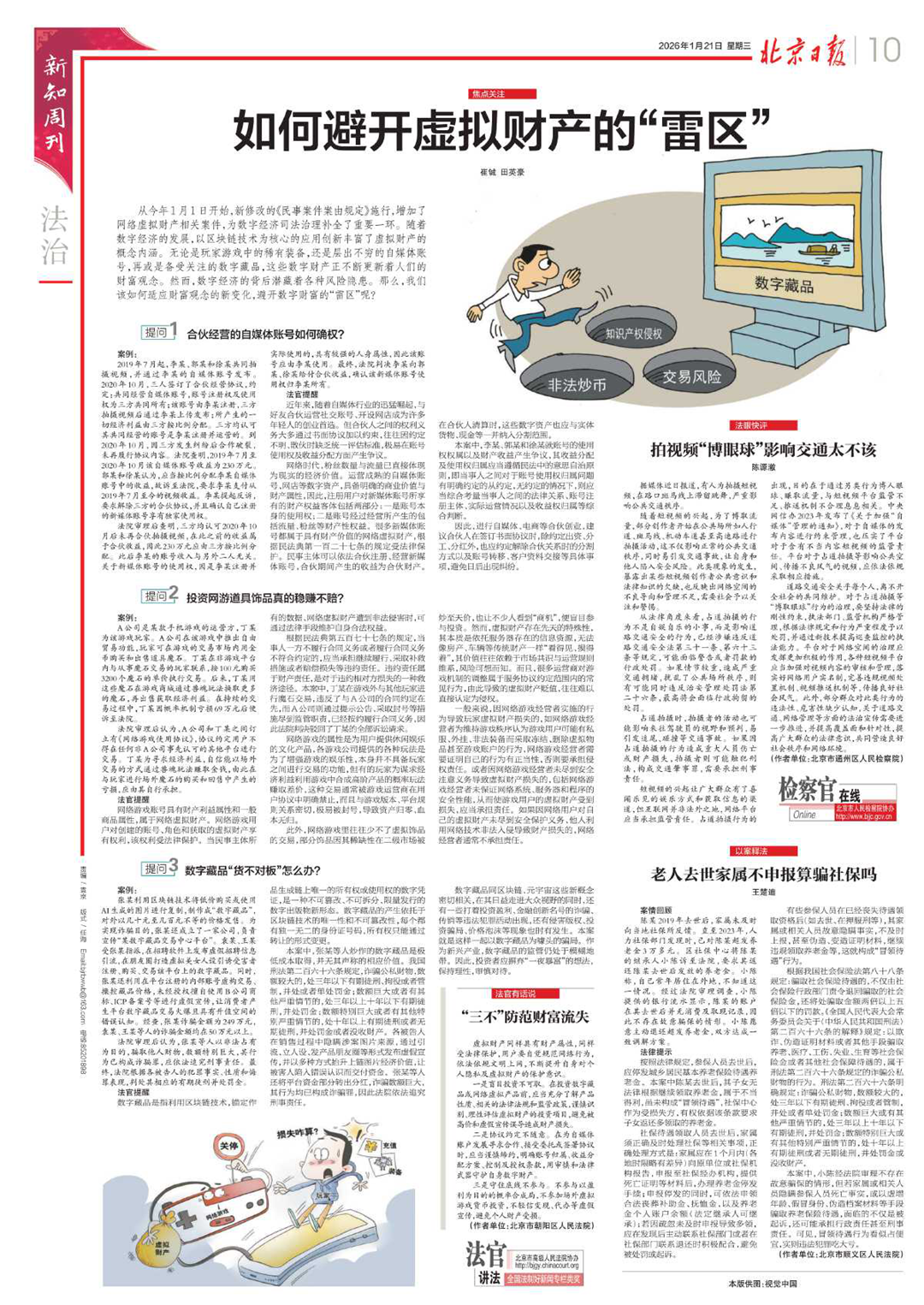 从今年1月1日开始,新修改的《民事案件案由规定》施行,增加了网络虚拟财产相关案件,为数字经济司法治理补全了重要一环。随着数字经济的发展,以区块链技术为核心的应用创新丰富了虚拟财产的概念内涵。无论是玩家游戏中的稀有装备,还是层出不穷的自媒体账号,再或是备受关注的数字藏品,这些数字财产正不断更新着人们的财富观念。然而,数字经济的背后潜藏着各种风险隐患。那么,我们该如何适应财富观念的新变化,避开数字财富的“雷区”呢?