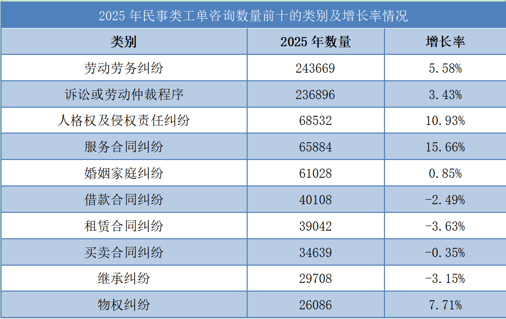 2025年,法律咨询中数量最多的仍为民事类咨询,共形成104.69万件工单,占咨询类工单的80.79%,主要咨询与日常生活密切相关的合同纠纷、劳动争议、婚姻家庭继承纠纷等问题。