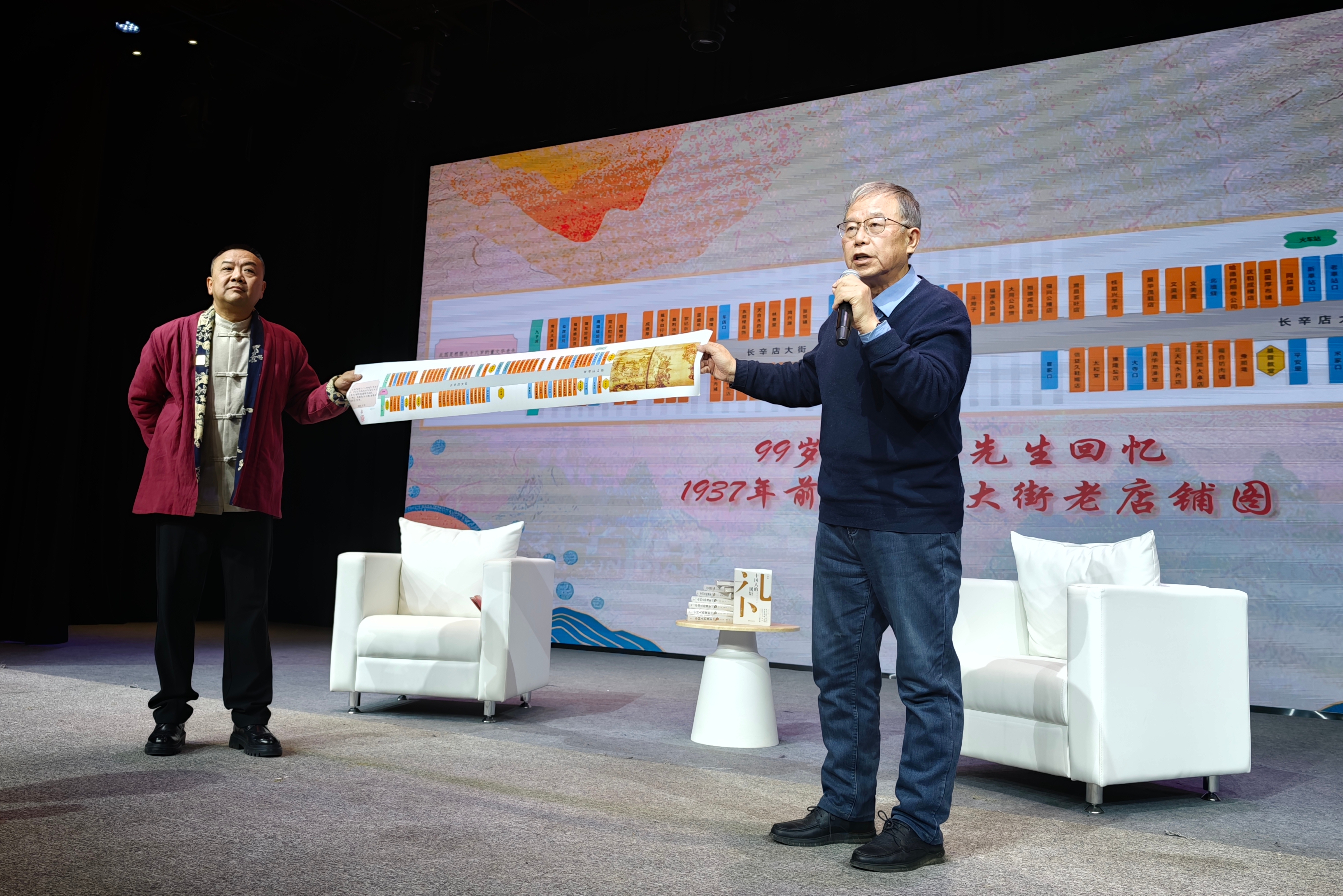 在童声合唱《胡同里的北京娃》的歌声中,“长辛老友会”会长尹喜军登台讲述“巷陌寓居礼”,他为大家展示了一批长辛店地区老房子照片,并讲起了长辛店老房子的建筑规矩,以及老长辛店居民的居家习惯。随着中车二七机车原宣传部部长邵鸿志的讲述,活动进入了“星火传行礼”篇。他展示了一幅根据辖区百岁老人董文华回忆绘制的1937年长辛店大街商铺林立、市井繁华的画卷,并从长辛店“九省御路”的建设故事,讲到京汉铁路,解析长辛店作为交通重镇的历史脉络,展望地区未来发展。