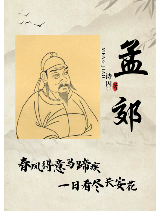 孟郊(751年-814年),字东野,湖州武康人。他出身于小官吏家庭,家中清贫,孟郊从小生性孤僻,很少与人往来。青年时代隐居于河南嵩山。孟郊四十一岁考进士未果,四十六岁,奉母命第三次来应试,才中进士登第,他兴奋至极,写下《登科后》诗:“昔日龌龊不足夸,今朝放荡思无涯。春风得意马蹄疾,一日看尽长安花。”