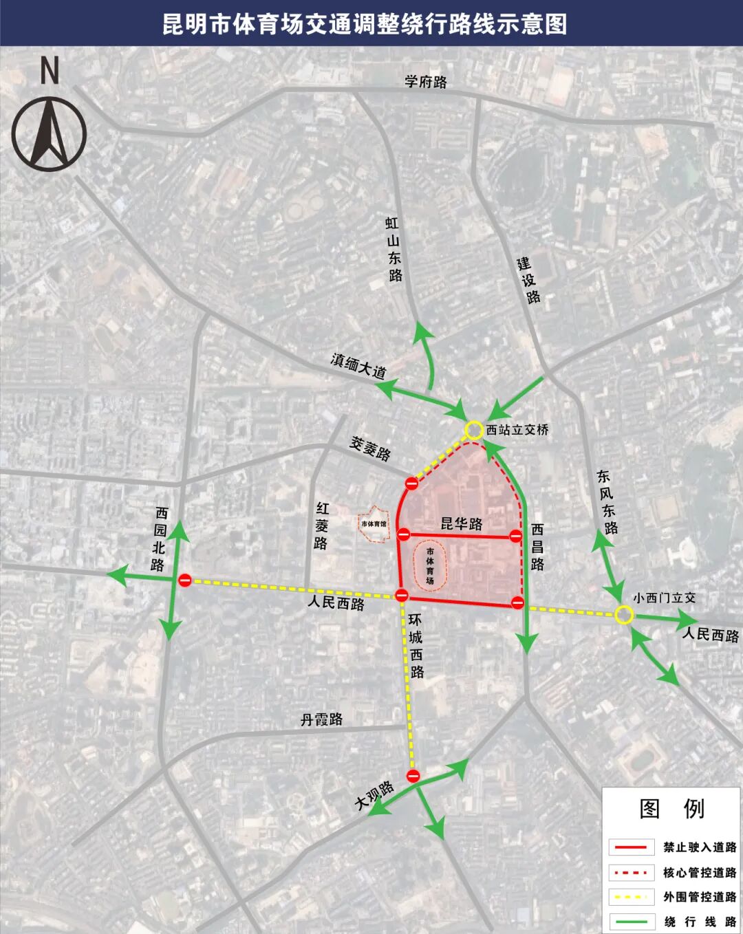 赛事期间,将根据现场交通情况,对昆明市体育场周边的昆华路、环城西路、人民西路等道路采取临时性交通调整措施。