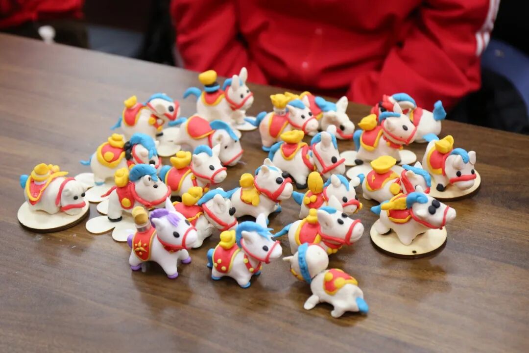 不一会儿,一匹匹色彩鲜艳的“福马”在手中诞生。大家为小马配上红色鞍辔,捏出飞扬的马鬃,每一件作品都洋溢着喜悦。