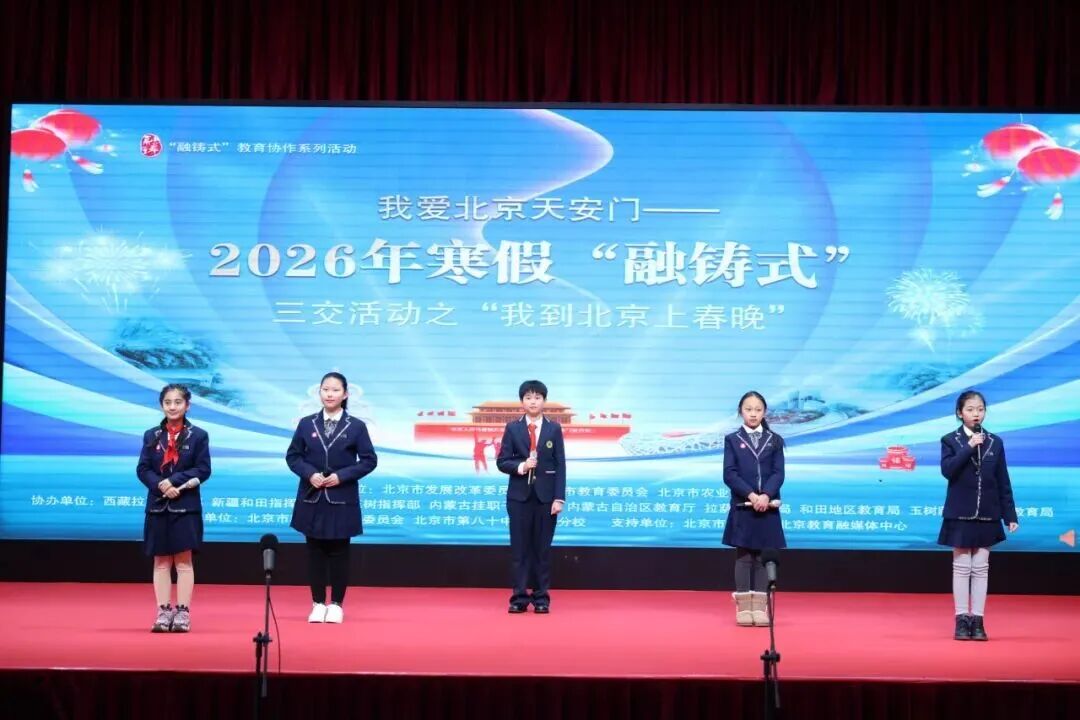 1月24日,北京市第八十中学管庄分校暖意融融,“我爱北京天安门”——2026年寒假“融铸式”三交活动之“我到北京上春晚”开营仪式在此隆重举行。来自北京、西藏、新疆、青海、内蒙古五地的青少年齐聚一堂,以艺术为媒,以友谊为桥,共同开启一场跨越山海的交融之旅。