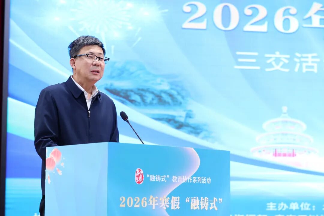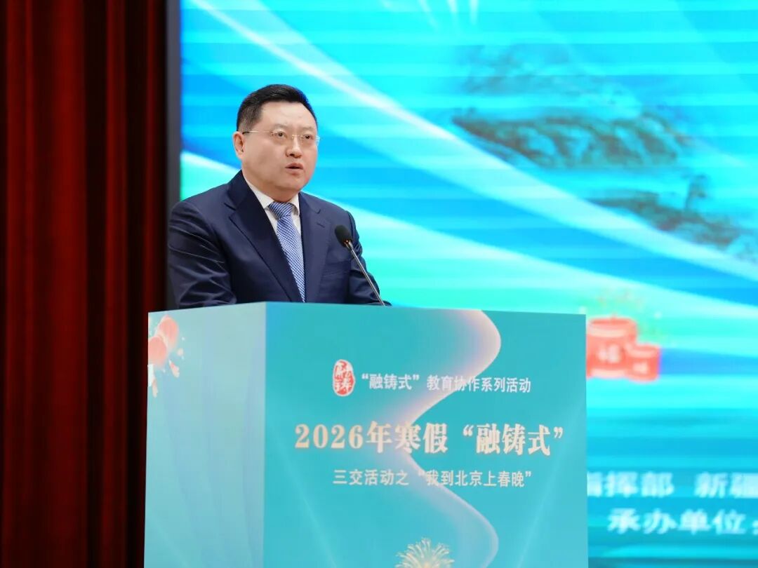 北京市教委二级巡视员葛巨众在讲话中指出,“融铸式”三交活动为五地青少年搭建了互学互鉴的平台,本次活动以北京春晚为载体,推动四地与北京学生1:1精准结对,构建“思政引领、多维立体、文化融合”的实践场景,让学生在“历史文化+红色教育+科技体验+现代生活”特色研学路径中深化认同,在“同台演出、交融共创”的春晚舞台上凝聚团结奋进的精神力量。