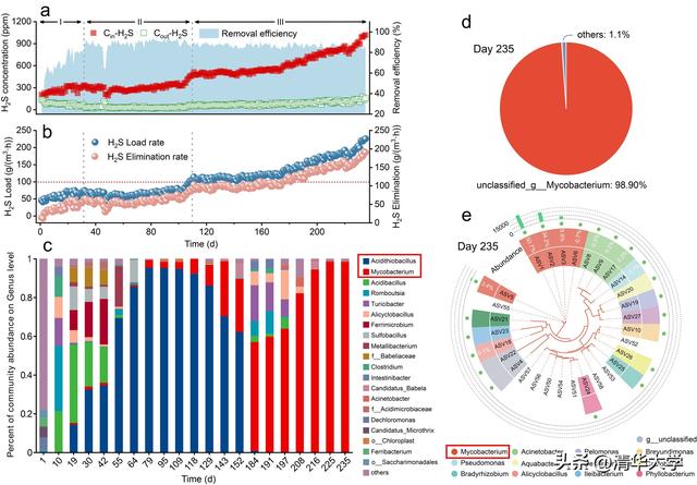 图2.反应器运行235天期间的性能表现与微生物群落演替。(a)H2S去除效率与进气H2S浓度的动态相关性;(b)H2S负荷与去除速率的时间变化;(c)运行各阶段属水平分类群的演变;(d)第235天物种解析水平的群落结构;(e)基于ASV的第235天系统发育分析