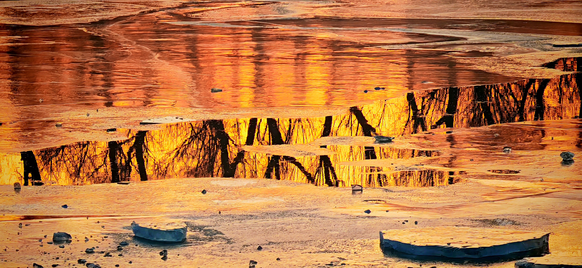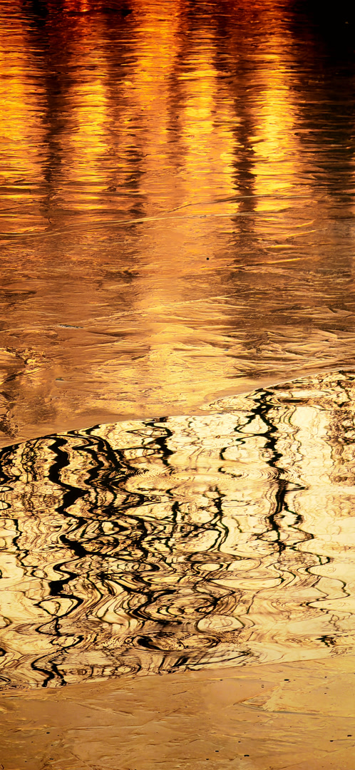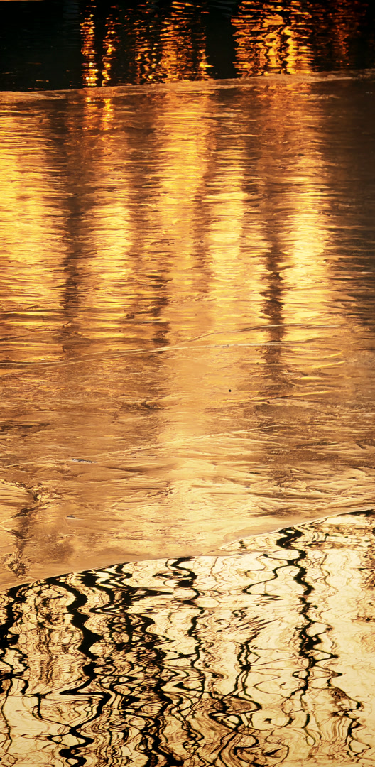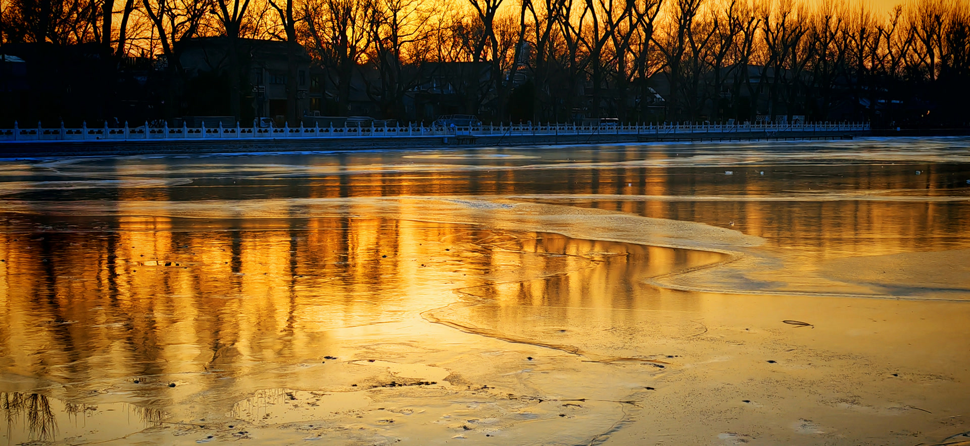 细观湖面,冰并非全然封合。有一泓未冻的活水,宛如冰面悄然睁开的眼眸。夕照坠入这清澈的瞳孔,被水流揉碎成万千缕金丝,在水下摇曳、流转、明明灭灭。
