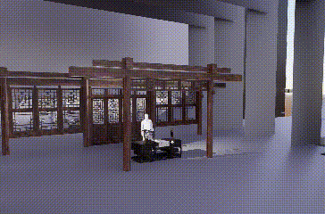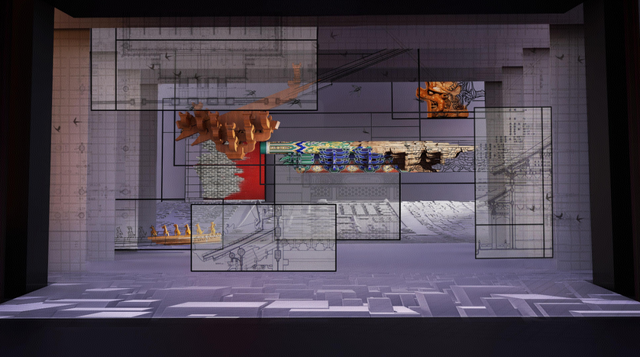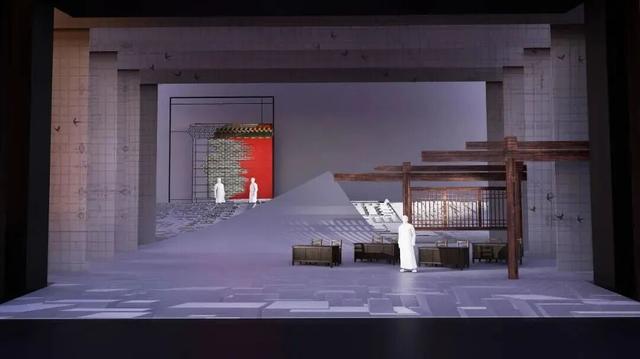 《雨燕》的舞台以北京中轴线为核心意象,整体呈现为一幅不断上扬、逐渐展开的历史建筑画卷。舞台通过真实建筑肌理与手绘图纸感的渐变融合,在局部与整体之间构建叙事层次。通过这样的舞台,观众可以看到一个“活的图纸”,身后的“沙盘”是一个北京城。“人”与“城”的精神同构,就像文化在传承中生生不息。