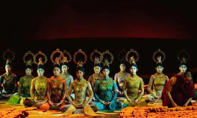 这部“颠覆想象”的舞剧以杨氏美学讲述东方哲思,用东方的轮回演绎生命的意义。与大多数《春之祭》版本只留黑、白、灰、红的极简美学相反,杨丽萍版《春之祭》的设计具有浓烈的杨氏东方美学风格:朱红、漆黑、钴蓝、土黄的浓烈色块,铺满地面的六字真言,度母光环上镶嵌的宝石,舞者的荧光指套,闭目时眼皮上绘着的佛眼……