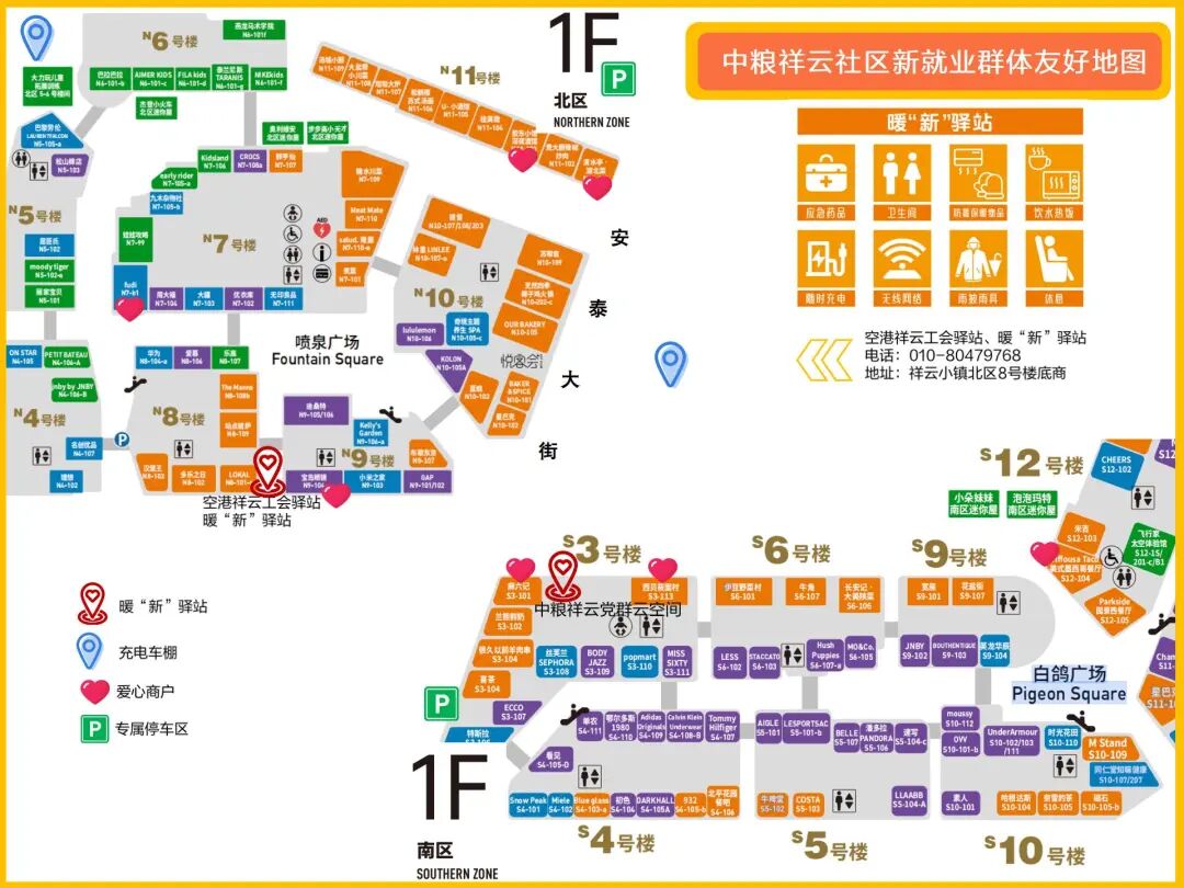 在祥云小镇南北区,暖“新”驿站内长期备有饮水、医药箱和充电设备,为穿梭往来的快递外卖小哥提供随时可及的休憩点。走进商圈,清晰的指引图、专属停车区,有效破解了配送“停车难、找点难、充电难”的痛点,让配送更高效,让商圈更有序。