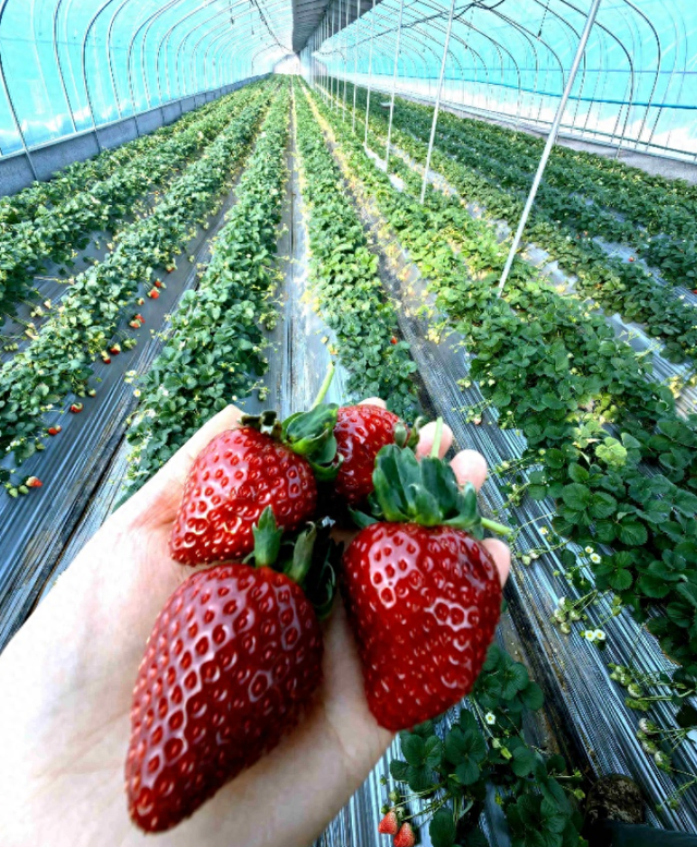 刚走进新店镇的智能大棚,记者就被“黑珍珠”吸引:不是纯黑,而是熟透后呈现出红得发黑的色泽,像裹了一层糖霜,拿在手里沉甸甸的,单颗重量直奔25克,果形饱满得快撑破表皮。这种草莓的口感比普通草莓更甜,据农户介绍,甜度直飙15度以上。