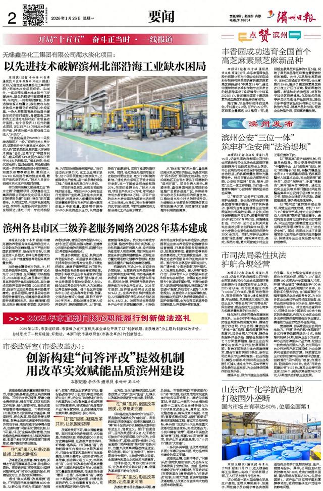 作为滨州破解北部沿海工业“缺水之困”的重要项目,无棣鑫岳化工集团有限公司海水淡化项目从规划时起便担负着“创新+绿色”的双重使命。从项目立项、用地审批到能耗评估,滨州市、无棣县两级发改部门全程跟进,通过一对一专班对接服务,为项目快速推进保驾护航。“我们这边淡水缺口大,化工企业用水紧张,这个项目既能减少地表取水,又能降低生产能耗,是一举多得的绿色工程。”无棣县发改局工作人员说。