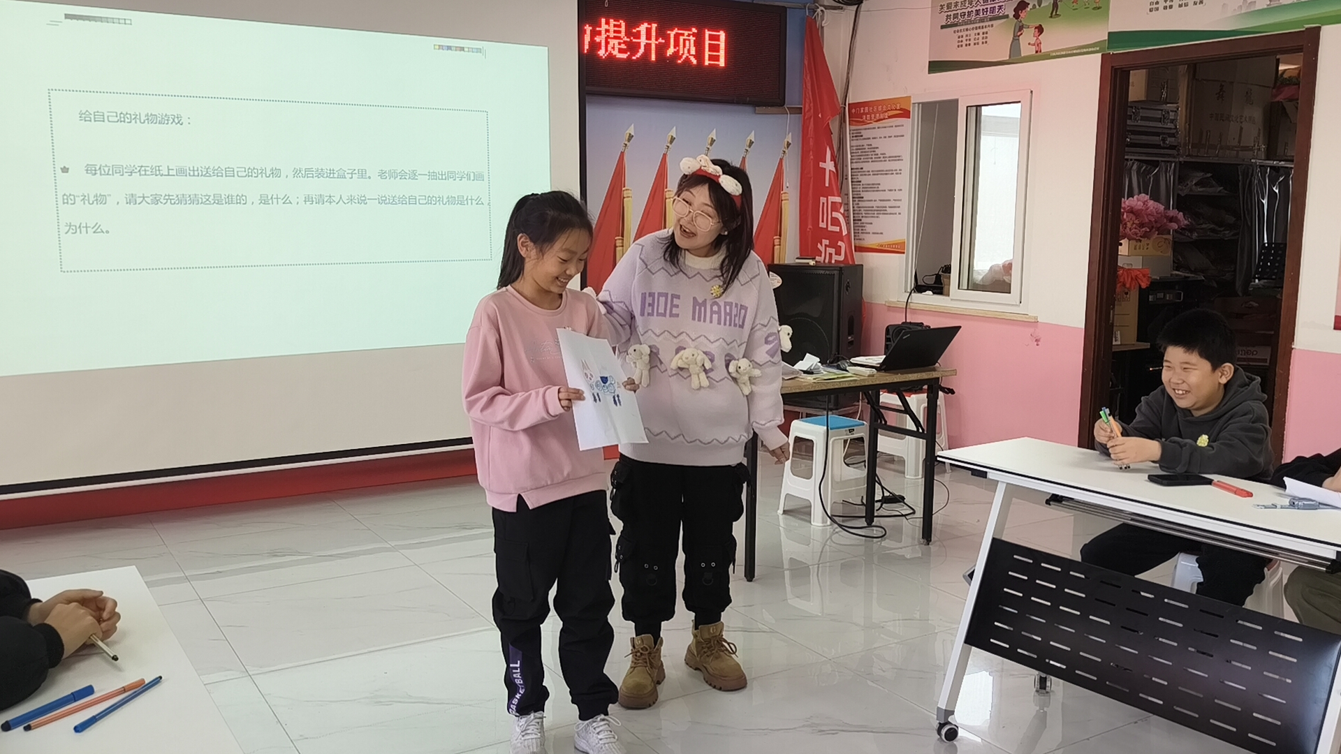 随后进入“爱是最珍贵的礼物”环节。孩子们温情回顾那些对他们而言意义非凡的礼物。其中,一位小女孩分享了她珍藏的毛绒小猫——猫耳悬挂的链子上,镌刻着她名字末字的印记。这份礼物不仅承载着朋友的深厚情谊,更成为她心中无比珍贵的宝藏。