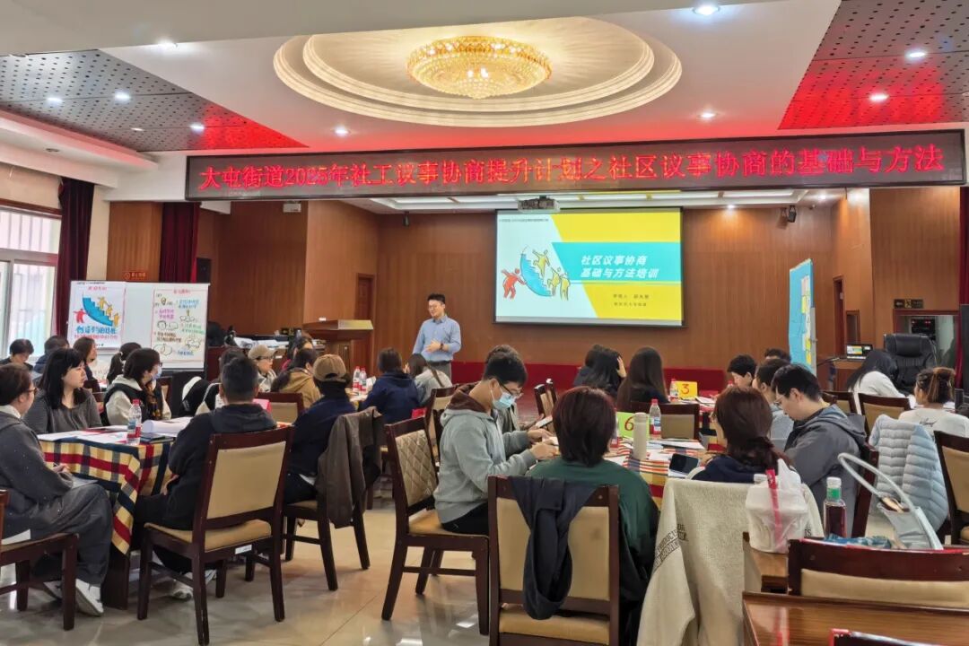 依托社区议事协商能力提升学习项目,邀请专业讲师邸永俊系统阐述议事协商流程构建与实战技巧,并运用参与式工作坊、小组讨论、实地踏勘等形式,帮助社工强化议事协商能力与破题解题本领。
