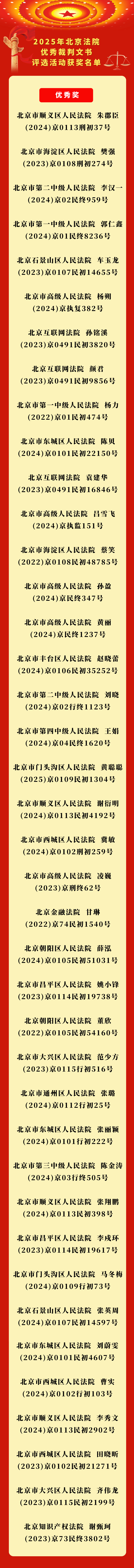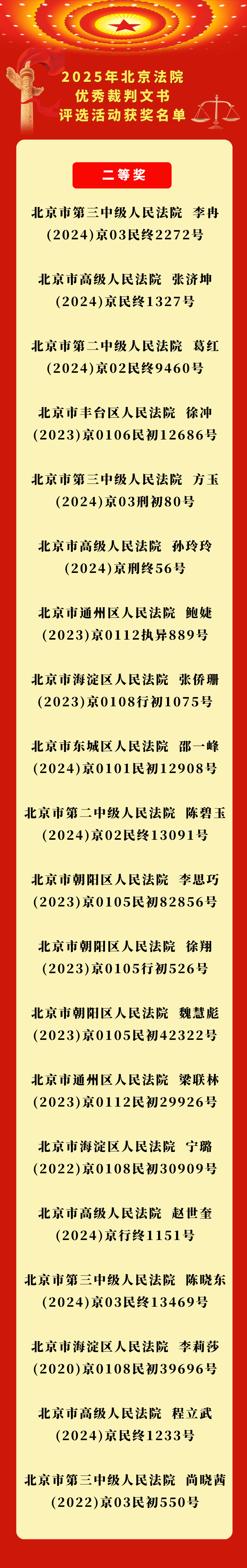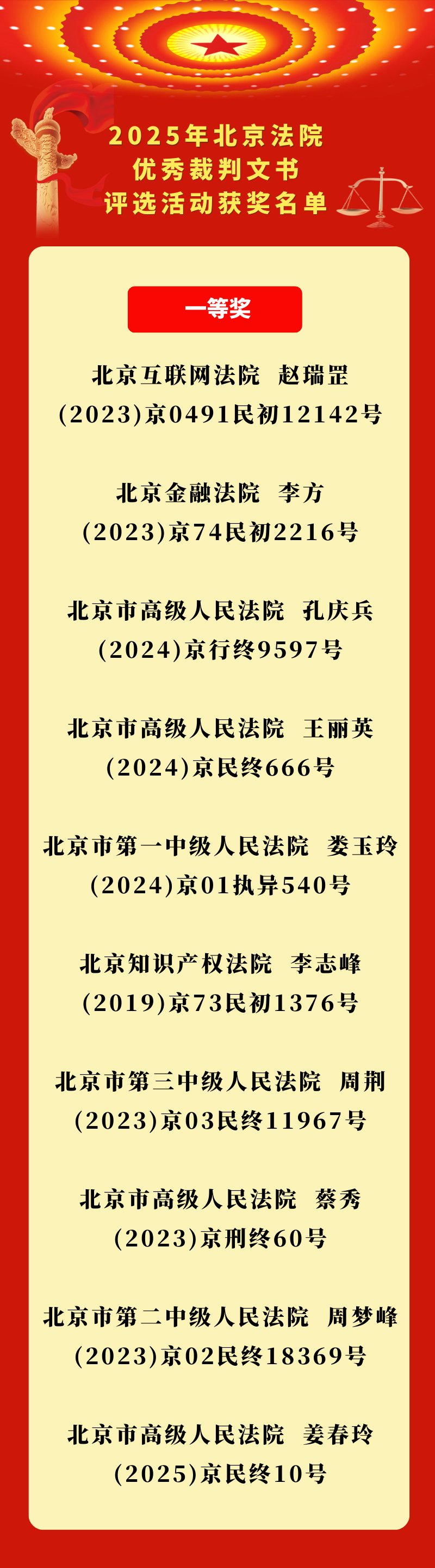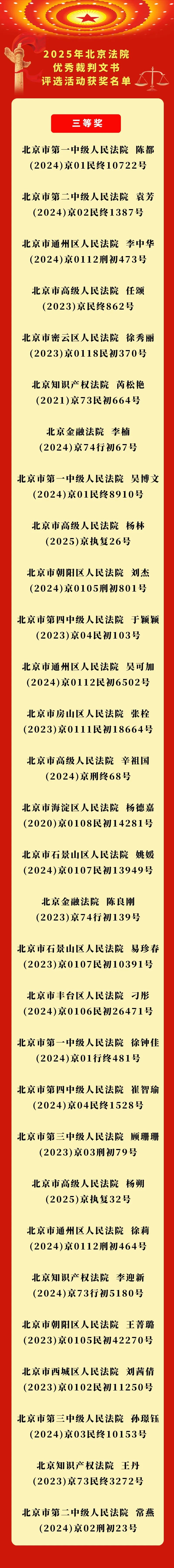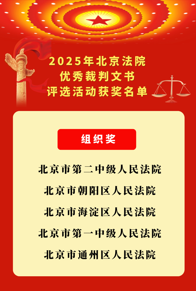 为加强和规范裁判文书释法说理,进一步发挥优秀裁判文书引领示范作用,促进法律适用统一,助推北京法院审判工作高质量发展,北京法院组织开展了第十一届北京法院优秀裁判文书评选工作,现已完成相关评选工作。经过初评、复评、总评三个阶段的评审,从全市三级法院推荐的裁判文书中,评选出获奖裁判文书100篇,其中一等奖10篇、二等奖20篇、三等奖30篇、优秀奖40篇。