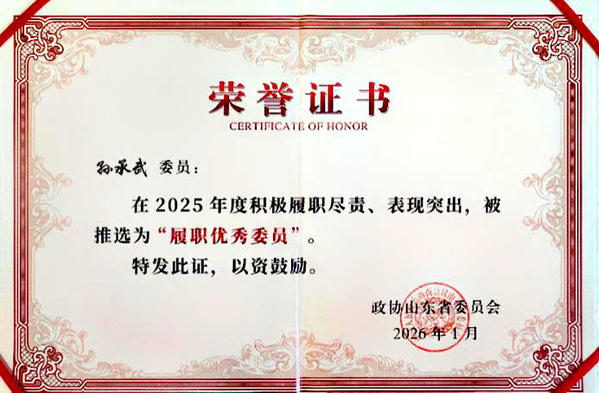 此次获评“2025年度山东省政协履职优秀委员”称号,既是对孙承武委员过往履职过程中勇于担当、建言献策所付出努力的肯定,也是未来在政协平台上继续肩负使命、砥砺前行的责任重托。面对荣誉,孙承武委员表示,他将以此为新的起点,珍惜荣誉、再接再厉,继续发挥在本职工作中的带头作用和界别群众中的代表作用,为推动我省“十五五”开好局、起好步,奋力谱写中国式现代化山东新篇章贡献更多智慧和力量。