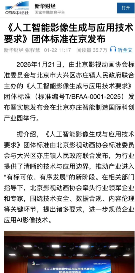 2026年1月21日,中国首个《人工智能影像生成与应用技术要求》团体标准发布会在位于亦庄镇的北京亦庄智能制造国际科创产业园举行。作为我国在AI影像技术规范化领域迈出的关键一步,该团体标准的发布为行业提供了清晰的技术与应用边界,推动产业进入“有标可依、有序发展”的新阶段。