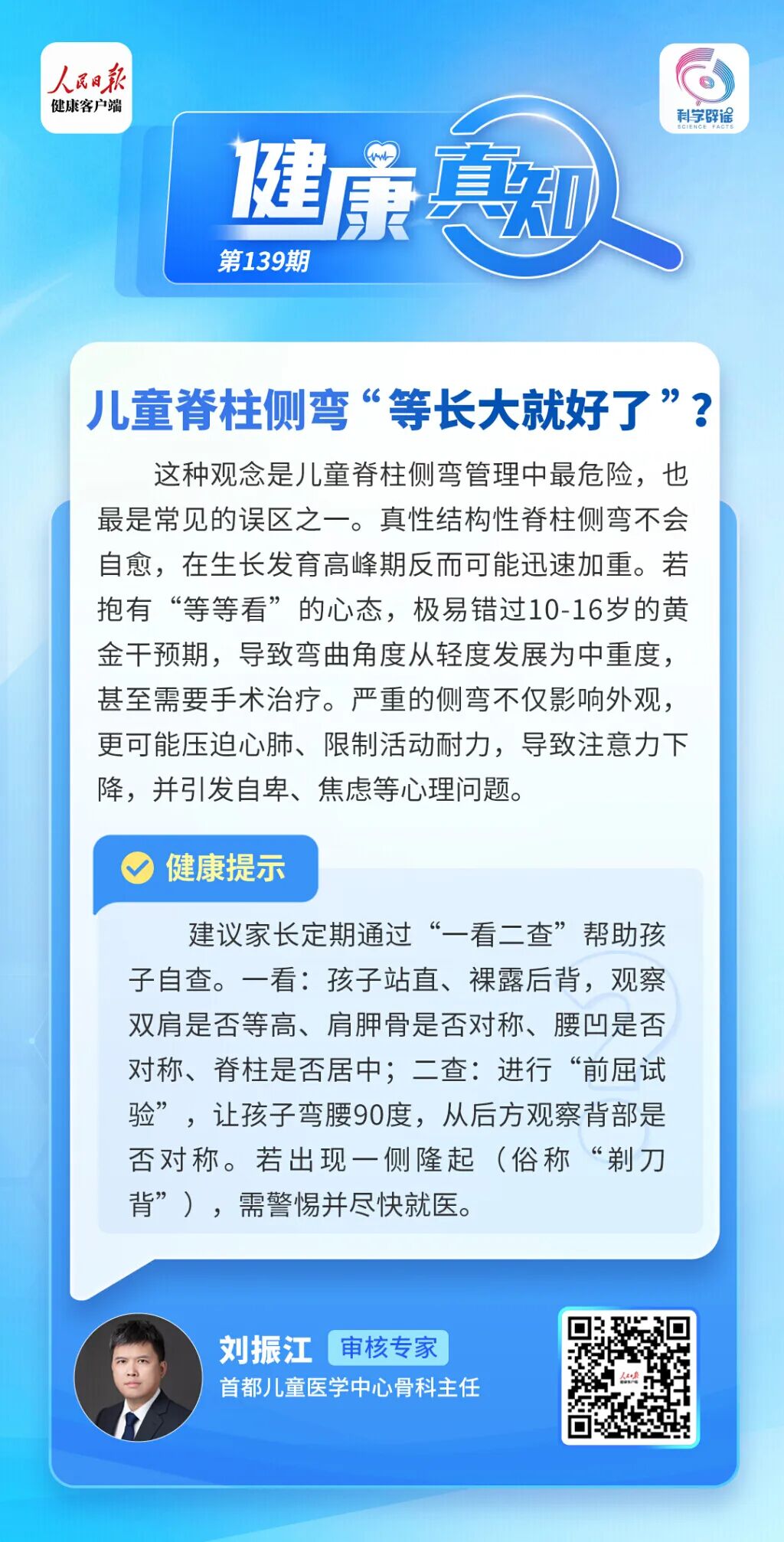 很多家长发现孩子有轻度脊柱侧弯后,常听到一些说法:“侧弯只是姿势问题”“孩子长大自然就好”……儿童脊柱侧弯真的会“等长大就好了”?家长如何帮助孩子自查脊柱侧弯?如何预防儿童脊柱侧弯?健康真知邀请首都儿童医学中心骨科主任刘振江为您解答。