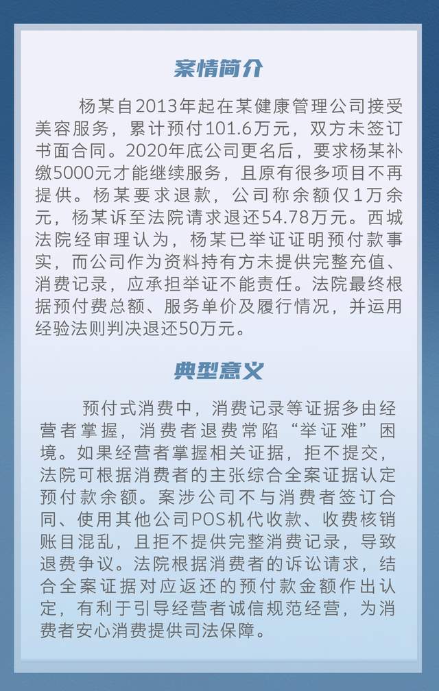 加强经营者和消费者权益保护,依法严惩生产销售伪劣产品等犯罪,“美容院预付卡退费案”破解消费者举证难维权困境,入选最高法院涉预付式消费典型案例。