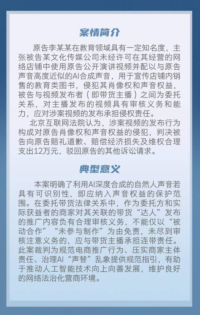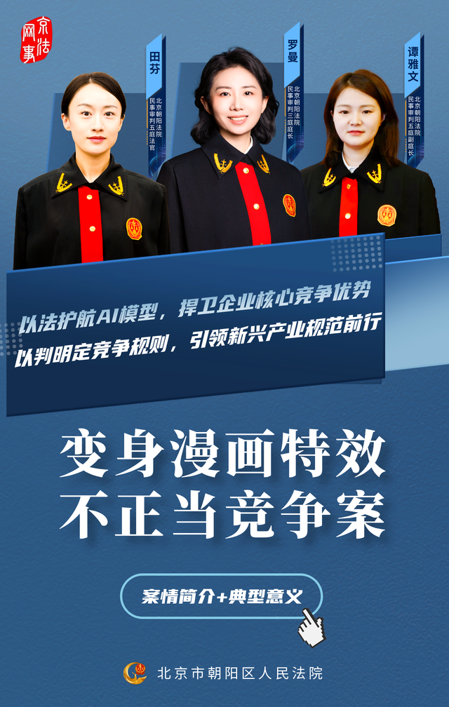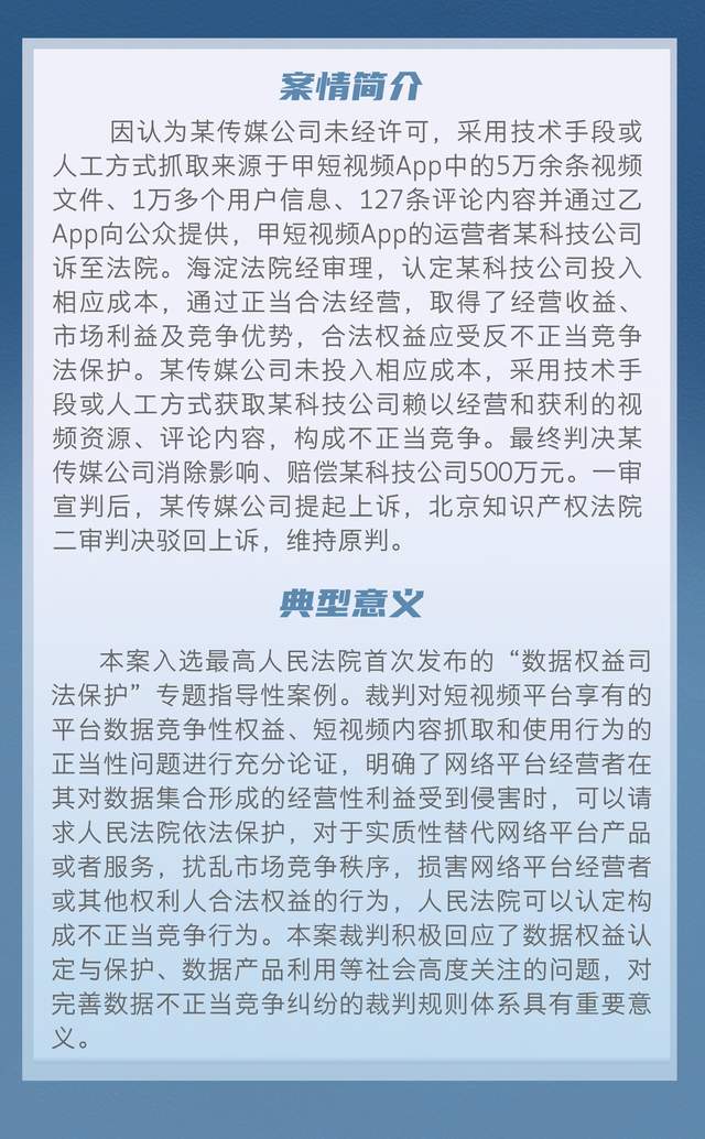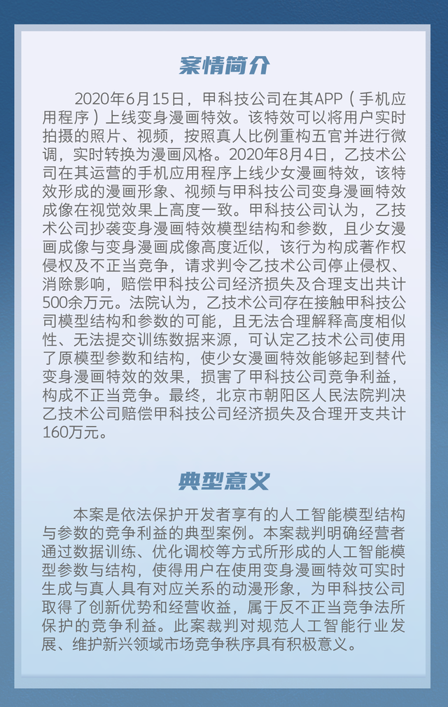 加强数据合法权益保护,审结涉数据产权、人工智能等案件9963件,坚持依法规范与促进发展相结合,在“AI生成声音带货”“虚拟数字人形象侵权”“变身漫画特效不正当竞争”“非法抓取网络平台数据集合”等有重要影响的新类型案件中,发挥裁判规则指引作用,助力新业态新模式健康发展。