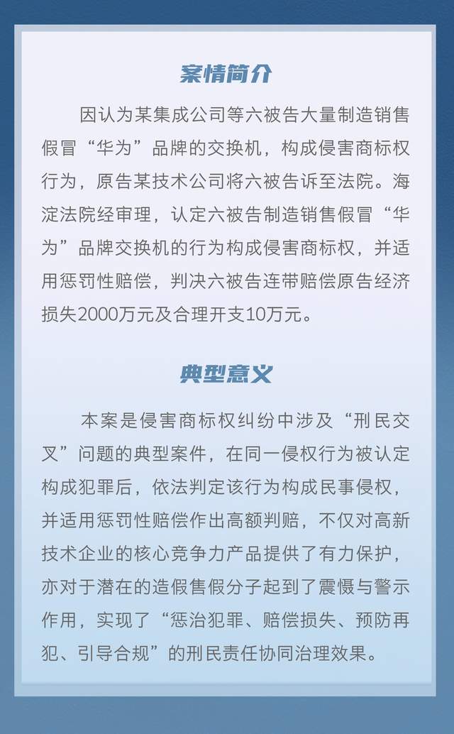 依法维护公平有序的市场环境,在涉华为、北京环球度假区等商标案件中,依法惩治恶意攀附知名商标的违法犯罪行为,有效保护企业商誉和商标权益。