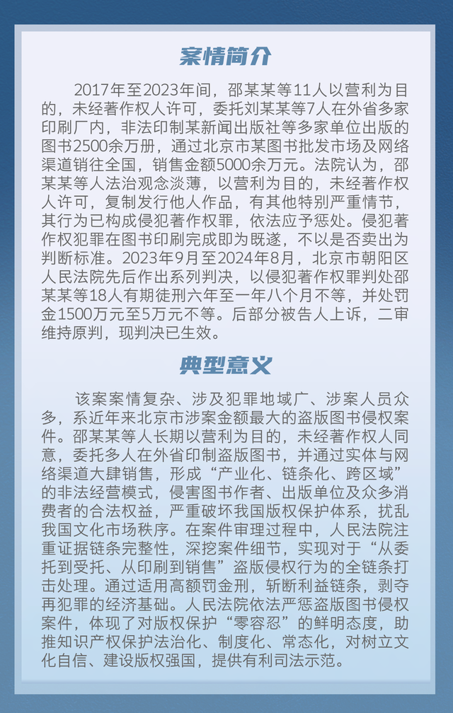 依法保障文化创新发展,审结涉著作权案件16598件,“3·01”系列盗版图书案获评版权强国建设典型案例,发布涉文物艺术品拍卖案件审判白皮书,依法保护博物馆数字化文物影像资料著作权,促进文化产业提质焕新。