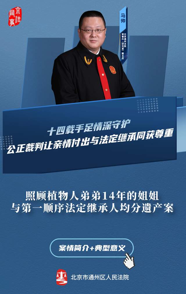 弘扬社会主义核心价值观,明确遗产分配要坚持权利义务相统一,依法判决照顾植物人弟弟14年的姐姐与第一顺序法定继承人均分遗产,促进良好家风建设。