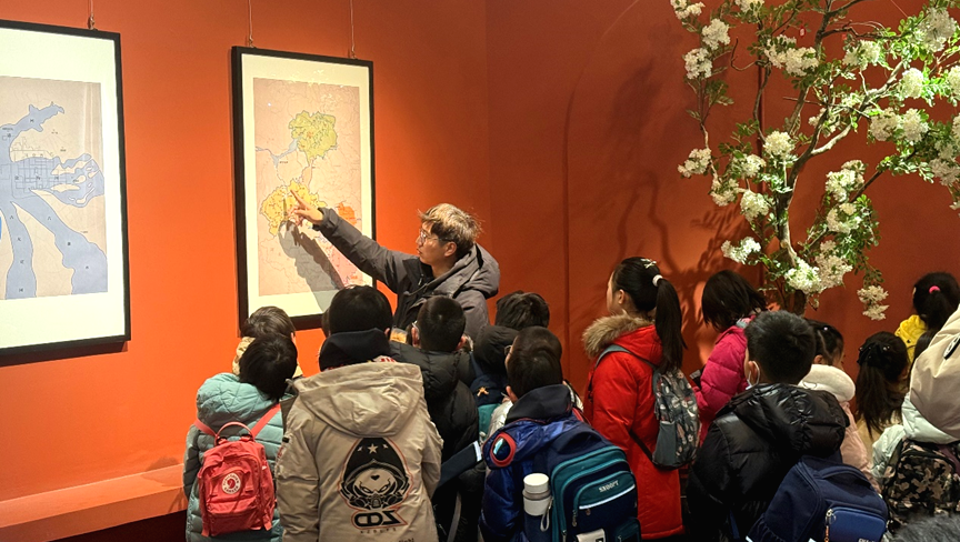 展厅内,“大河汤汤——从远古走来的永定河”“瑰丽多彩——流传千年的民间传说”“风景如画——两园一河的生态画卷”三大板块循序渐进,地理地图、古画印刷展品与AI文生图作品交相辉映,全方位展现永定河的自然变迁、人文故事与生态新貌。