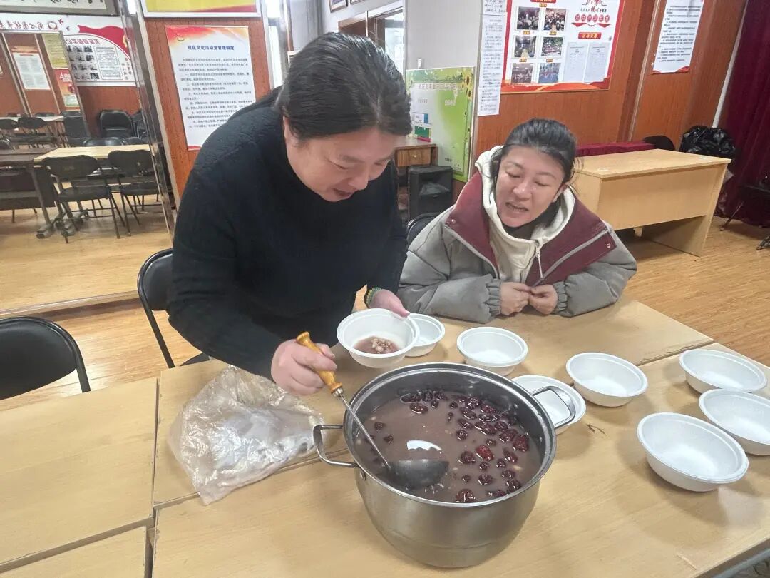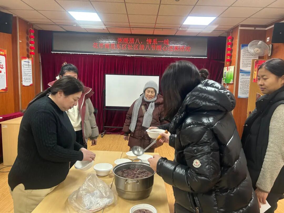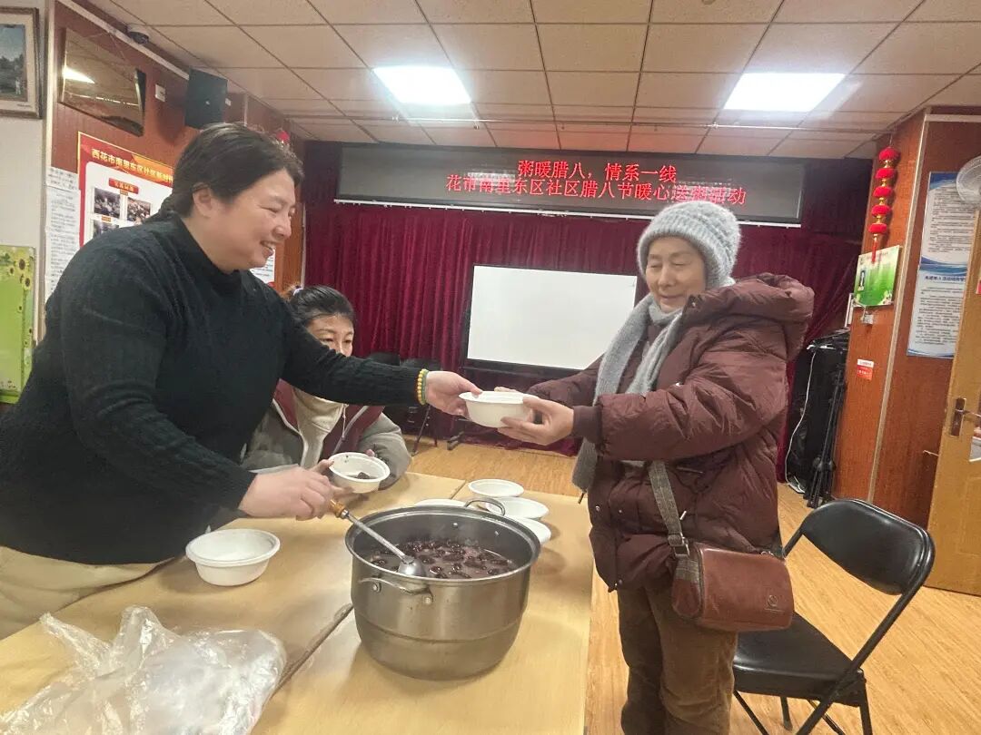 “师傅,天冷,喝碗粥暖暖身子!”在西花市南里东区社区活动室,志愿者们凌晨就开始忙活——泡糯米、洗红枣、炖莲子,熬了3小时的腊八粥,第一时间送到了辖区保洁、保安手中,还附上了手写福字。