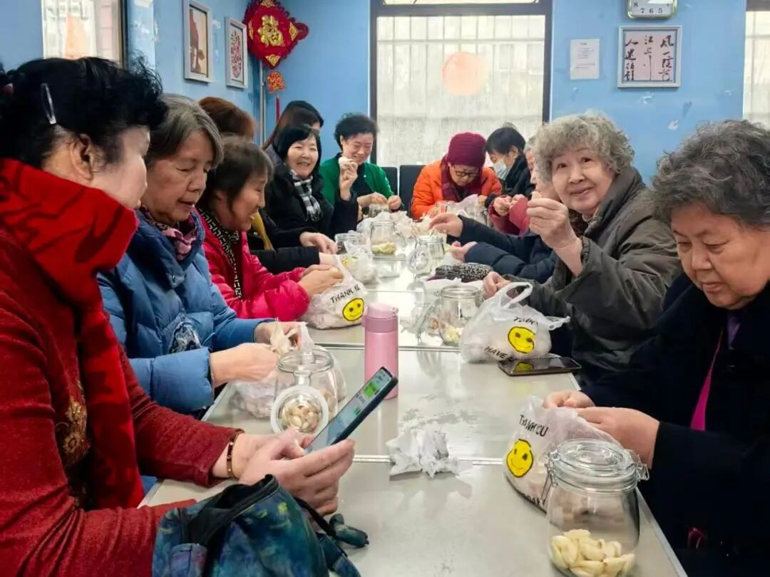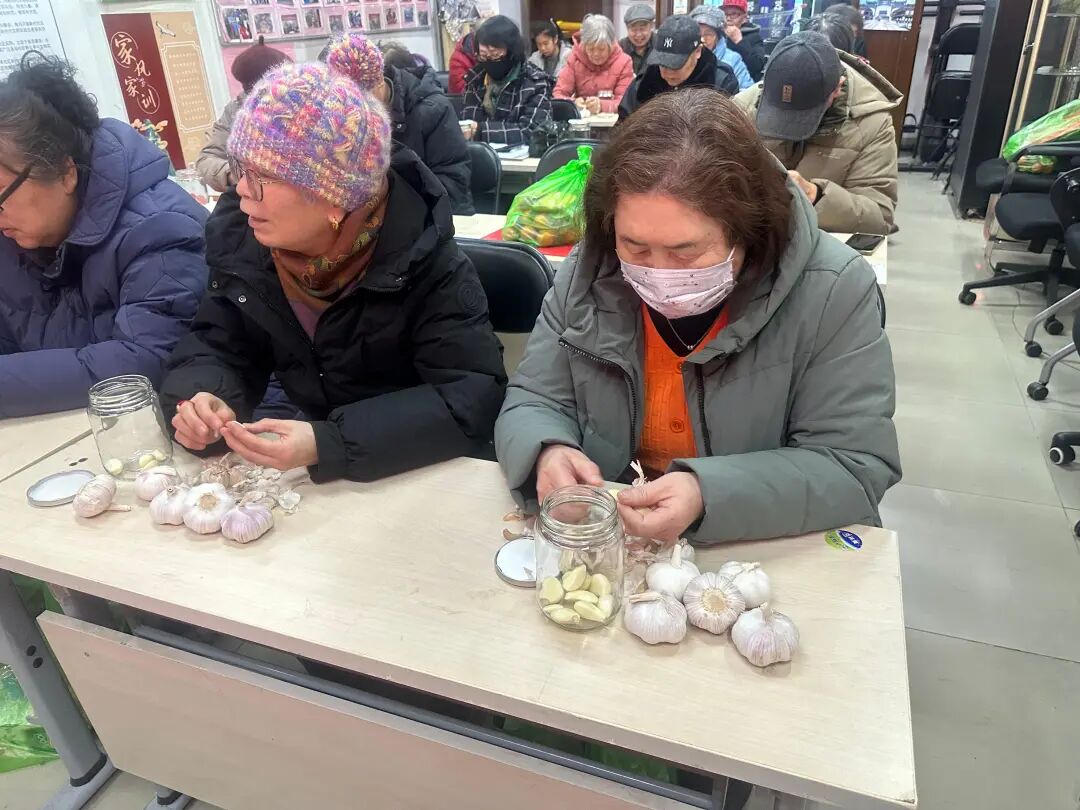 “泡腊八蒜要选紫皮蒜,醋得用香醋,密封后放阴凉处……”国瑞城西区社区的社会化退休人员茶话会上,工作人员手把手教大家腌腊八蒜,玻璃罐里的蒜瓣慢慢变绿,街坊们边做边聊家常,笑声不断。