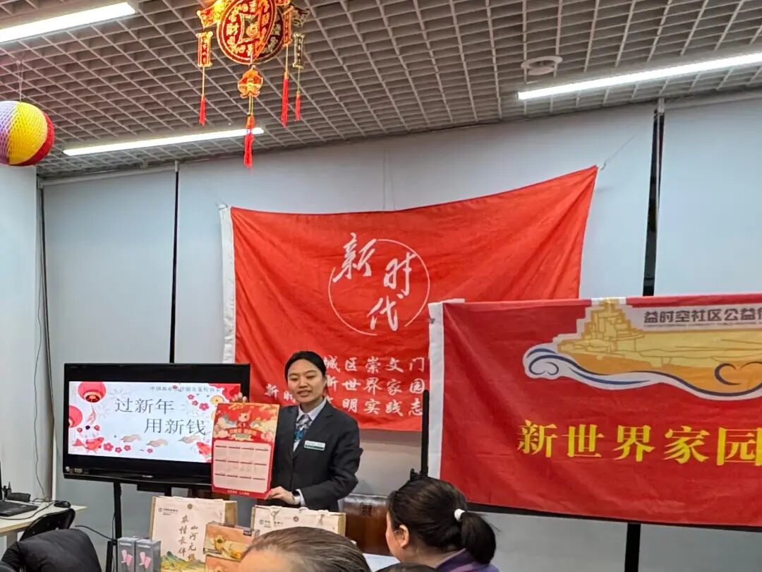 新世界家园社区邀请招商银行顾问,把“春节习俗”和“防诈知识”结合——讲完腊八喝粥的讲究,再教大家“理性消费、远离诈骗”,趣味问答环节还送新年日历,小朋友们举着手抢答:“我知道!腊八粥要放8种食材!”