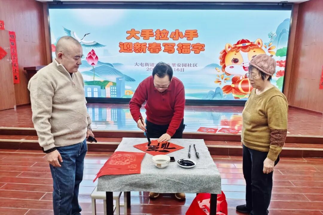 安慧北里安园社区写福字活动,社区邀请书法爱好者现场挥毫泼墨,笔尖流转间,一个个苍劲有力的“福”字、一副副寓意美好的春联跃然纸上。