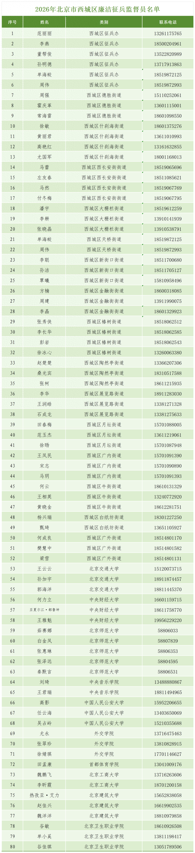 西城区廉洁征兵监督员名单