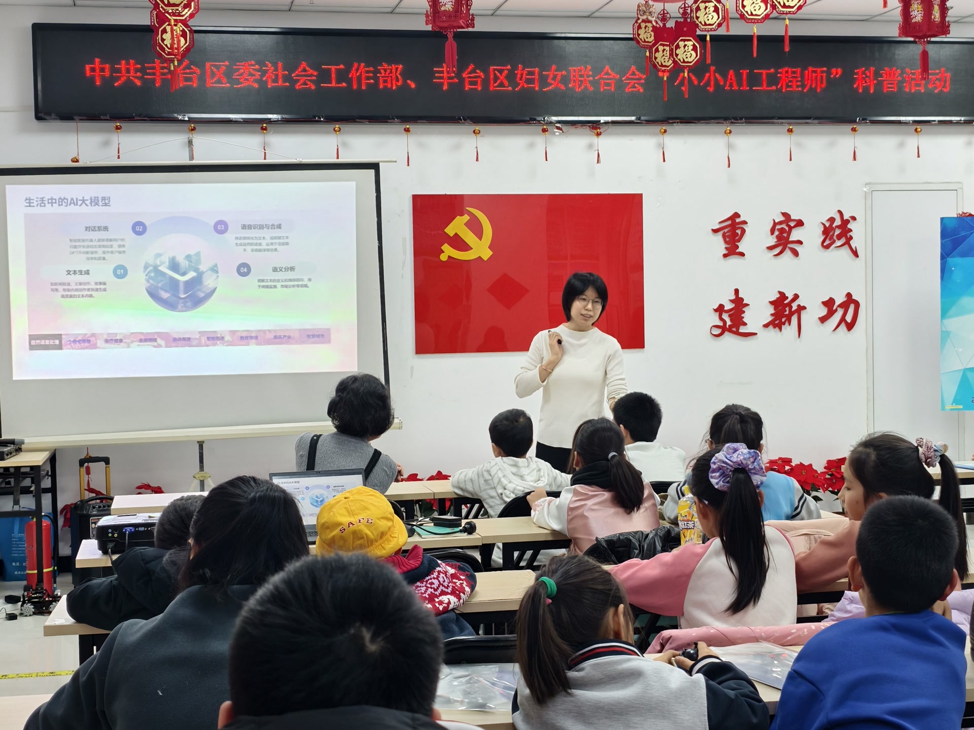 2026年1月23日,毕业于清华大学的刘文正博士正在为孩子们讲解AI知识。当日,由中共北京市丰台区委社会工作部支持的“小小AI 工程师”科普公益项目在丰台区长辛店街道中体奥园社区成功举办。据了解,这是该项目自去年启动以来在新的一年举办的第一场活动。来自社区的30多名小朋友在家长的陪伴下参加了学习。北京学校六年级学生韩沛霖作为获奖者代表做了分享。