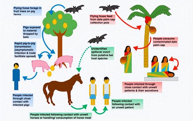 直接接触被感染的果蝠、猪、马等动物,或其体液(血液、尿液、唾液等)可引发感染。在马来西亚首次确认的疫情中,多数人类感染病例均因无防护接触病猪或其污染组织所致。