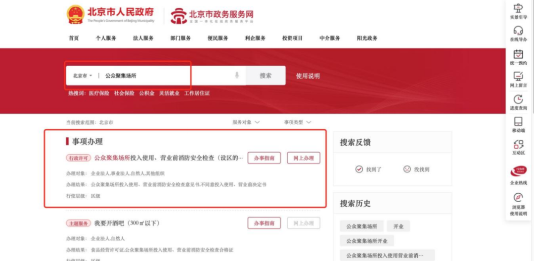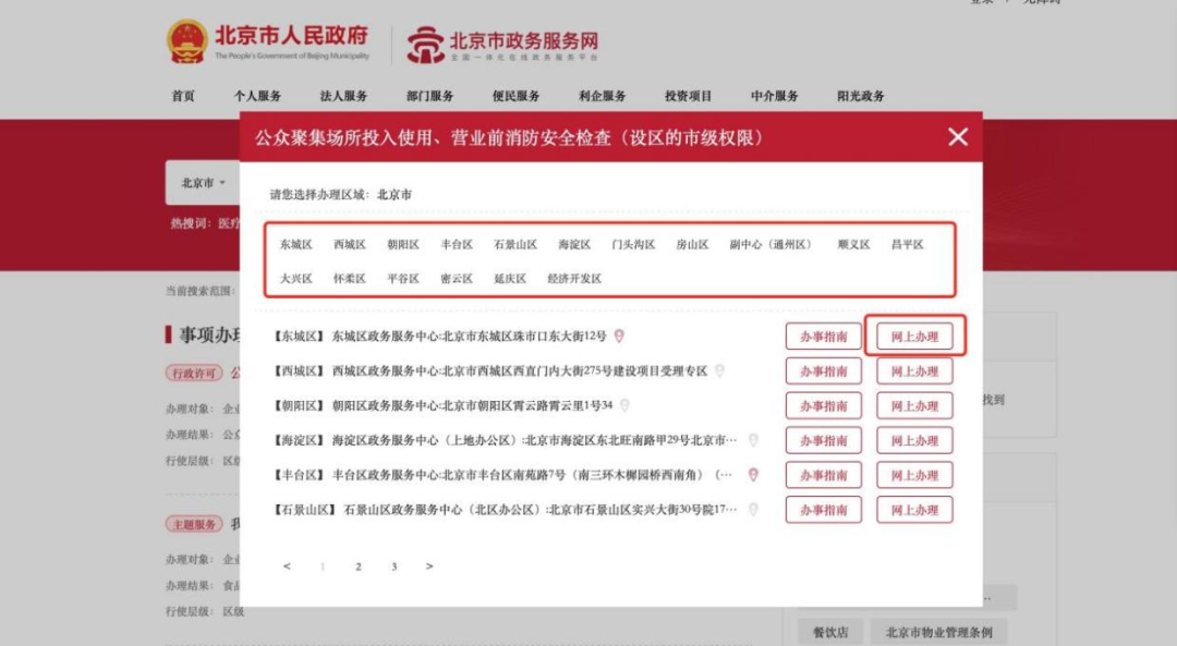 登录北京市政务服务网(https://banshi.beijing.gov.cn)或“京通”APP线上办理,搜索栏输入“公众聚集场所”或“开业前检查”→找到“公众聚集场所投入使用、营业前消防安全检查(设区的市级权限)”→选择所在区级→登陆身份信息→立即办理。