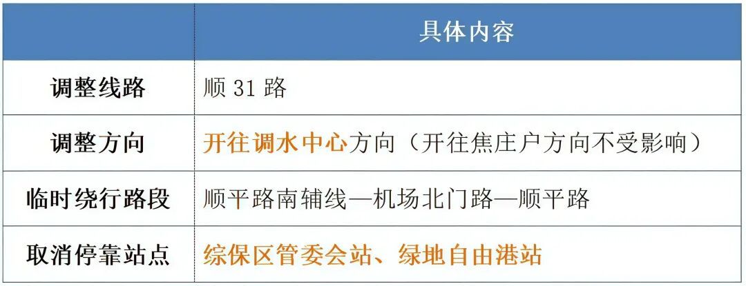施工期间,线路临时绕行顺平路南辅线—机场北门路—顺平路,综保区管委会和绿地自由港两站暂时取消停靠,确保线路整体运行效率基本稳定。