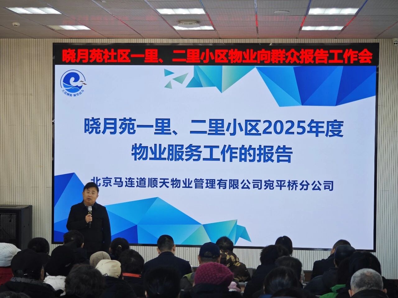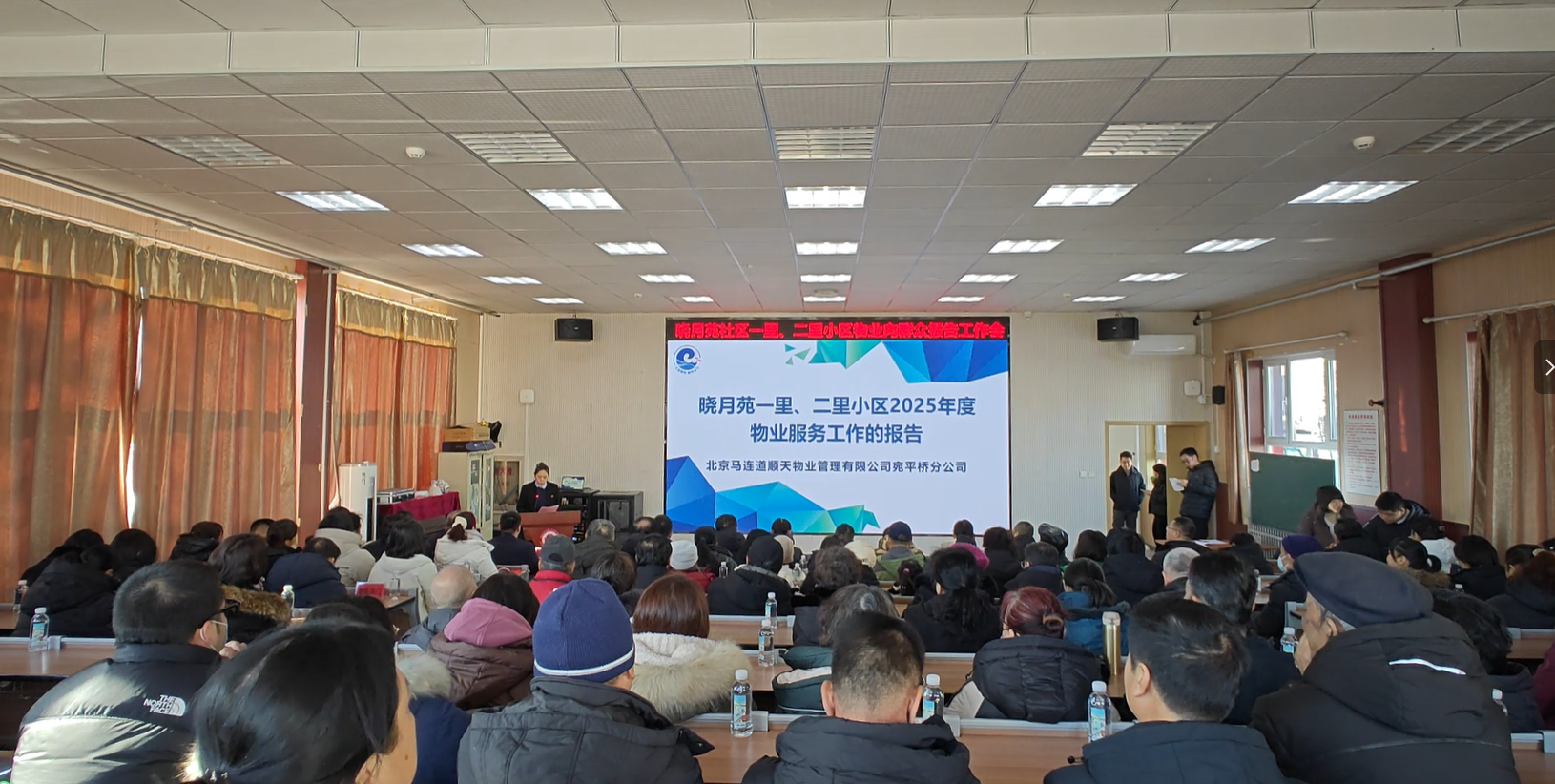 北京马连道顺天物业管理有限公司宛平桥分公司由负责人于圣铧向参会人员全面汇报晓月苑一里、二里小区2025年度工作情况,包含服务履约、问题解决、物业自身建设、物业收支等方面。并对小区物业服务中存在的问题具体分析,呼吁居民共建共商、主动接受居民监督。于圣铧代表物业服务企业承诺,在今后的工作中将继续以最大的诚意和努力,聚焦服务短板,落实改进措施,与全体业主共同建设好美丽家园。