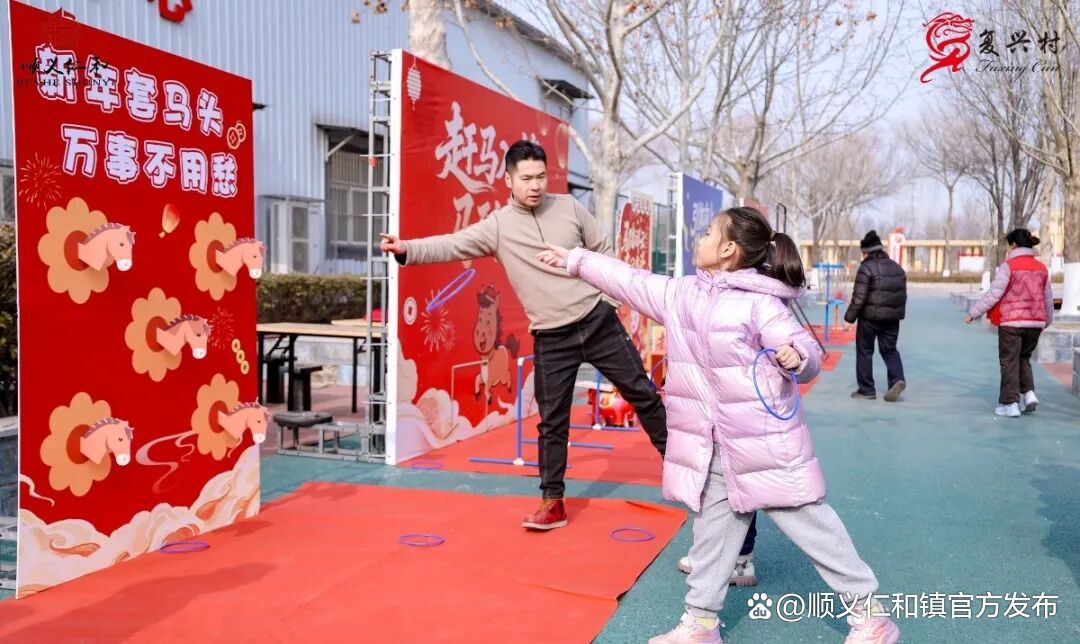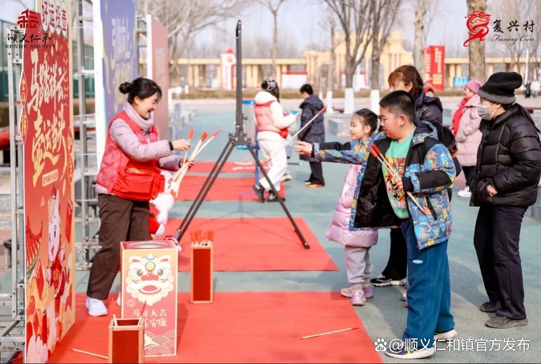 汇演未启,欢乐先行。下午的仁和文体广场,早已不是一个空旷的场地,七个洋溢着欢声笑语的“能量站”分布在场中,成了全村老少的游艺乐园。传统投壶、创意“套马头”项目中,专注瞄准与命中后的欢呼相映成趣;手工冰球、飞盘高尔夫则让孩子们尽情奔跑,也让家长们重拾童趣。最富年味的莫过于拓印马年年画,村民亲手用墨拓出姿态矫健的骏马与饱满的“福”字,将一份份古朴而真挚的祝福带回家中。笑声、喝彩声、交流声交织,新春的喜悦在游戏互动中提前抵