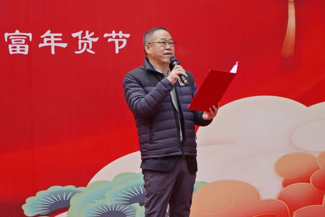 大屯荟北京商业管理有限公司董事长周福银介绍年货节市集特色、参展商品种类及专属优惠活动。