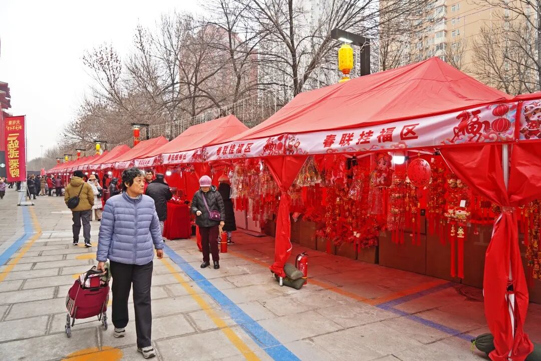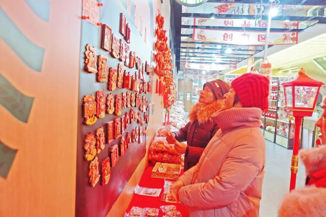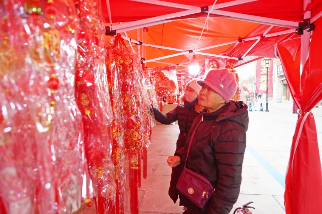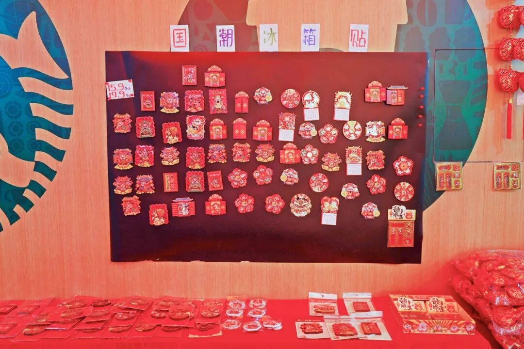 新春装饰区里,马年文创、国潮冰箱贴、红灯笼、中国结、春联、福字、窗花等传统年货一应俱全。
